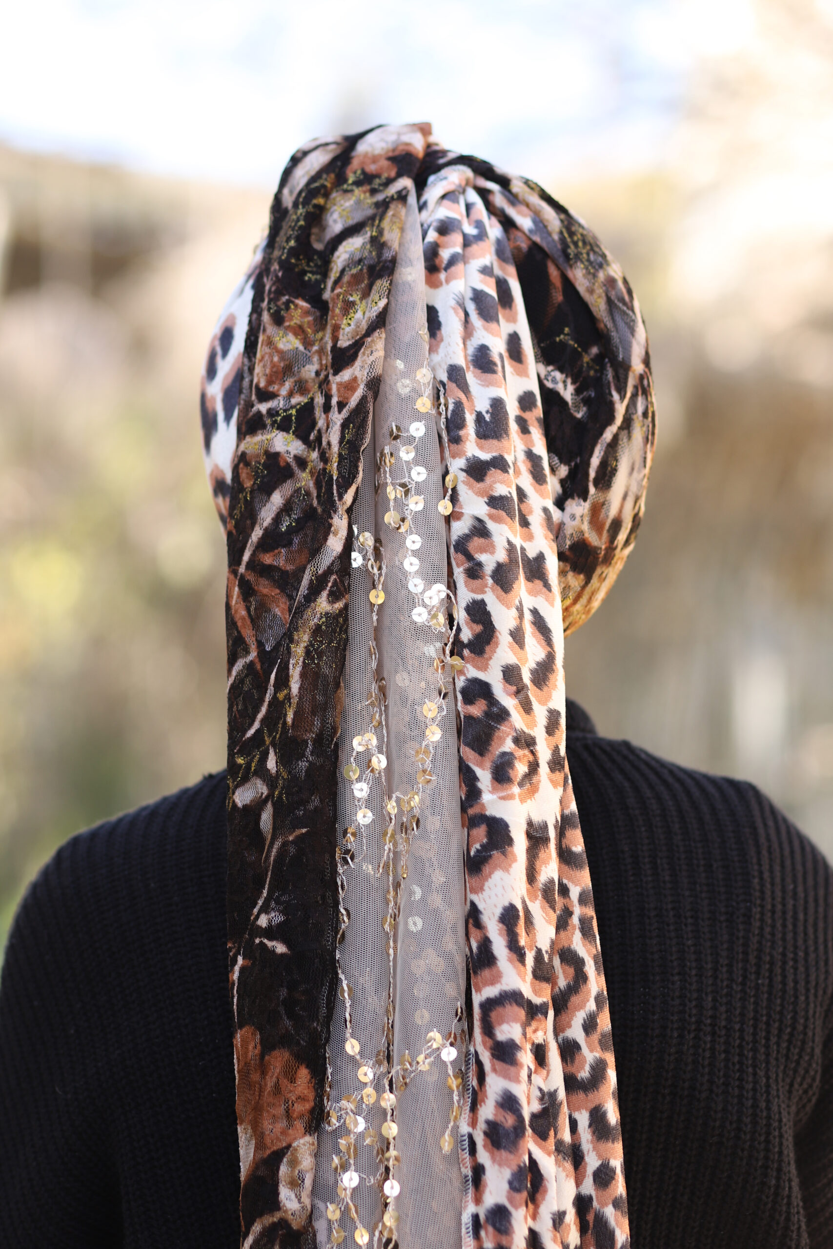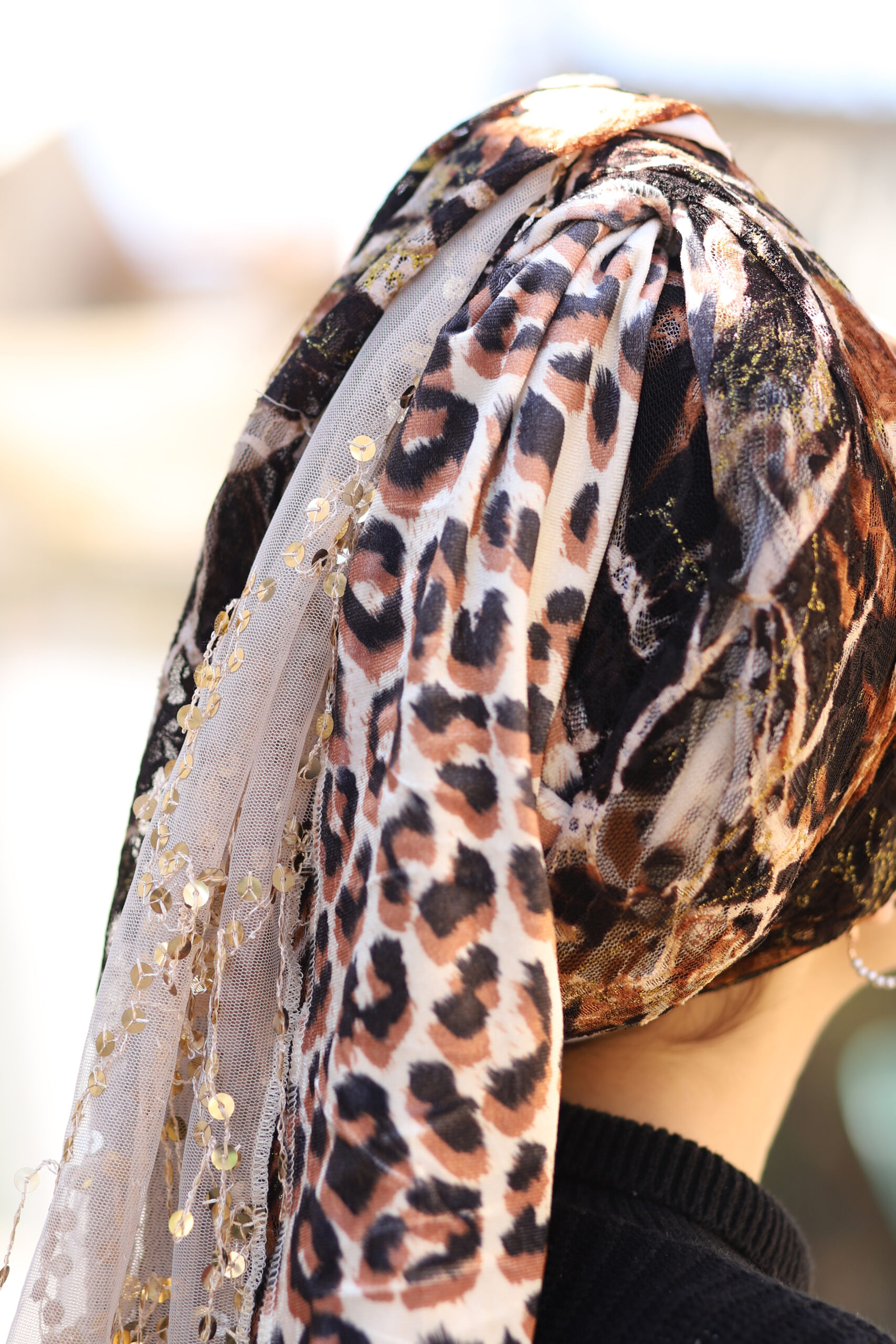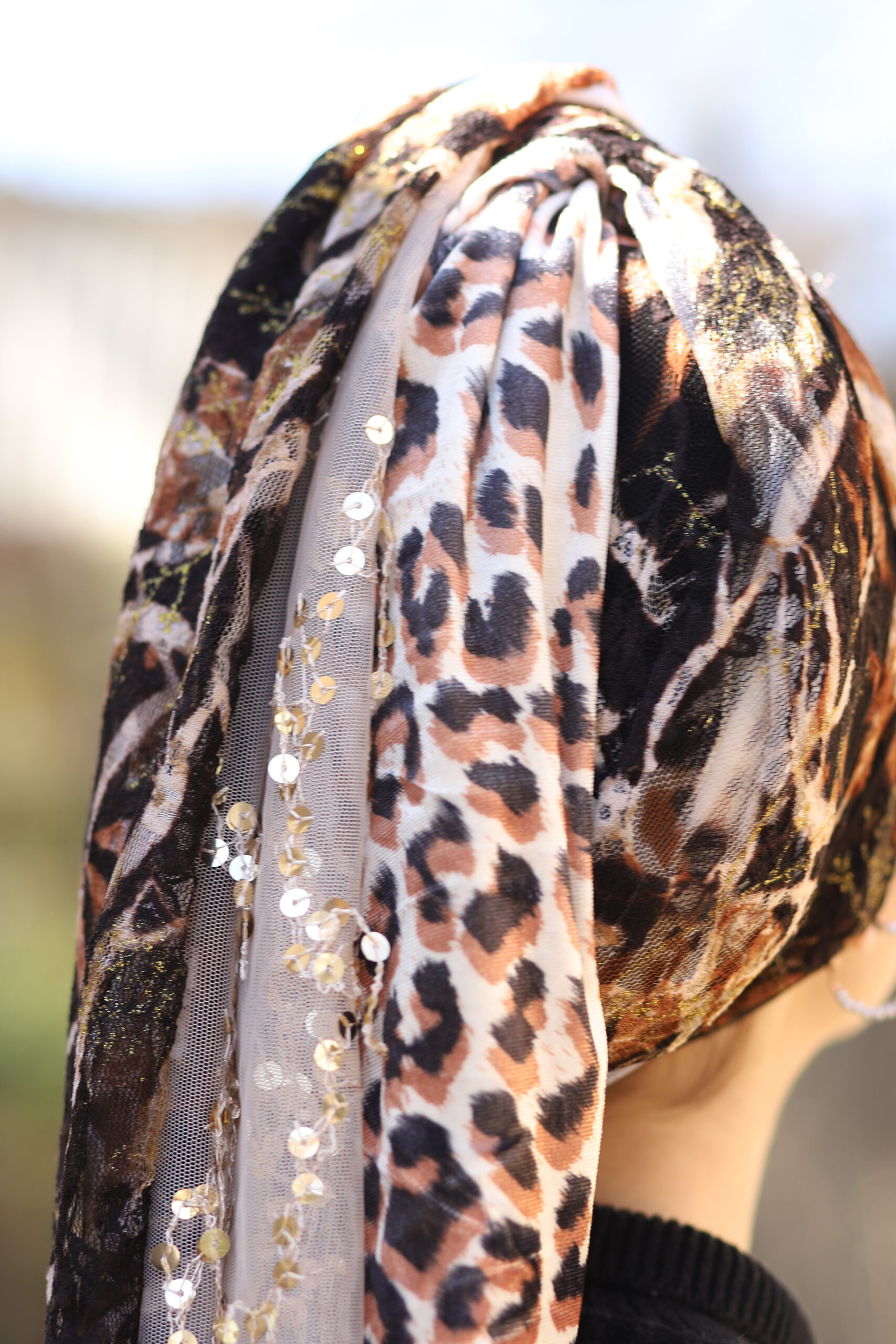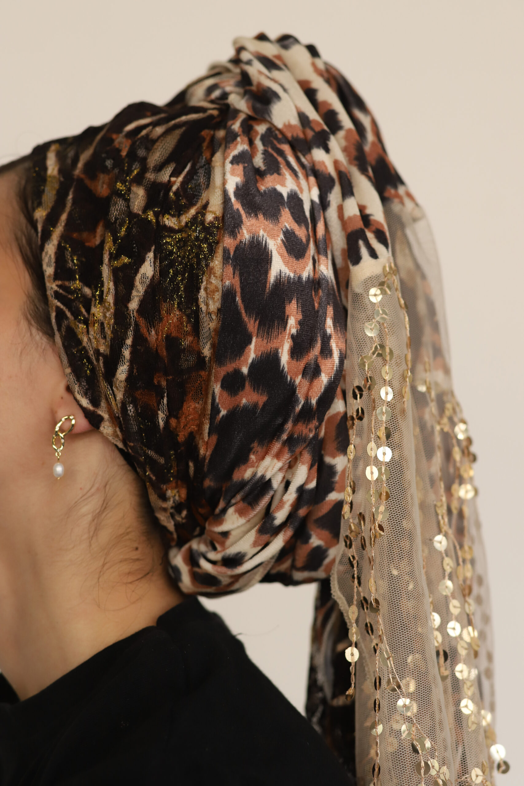 מטפחת מבד קטיפה מנומר ייחודי שמשדר יוקרה ונוכחות. משולבת עם בד תואם רך ונעים. ללבישה נוחה ואלגנטית לאורך כל היום.