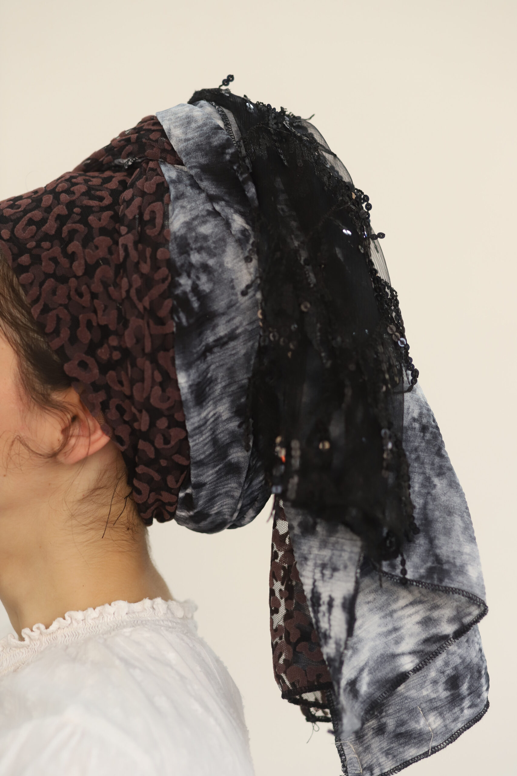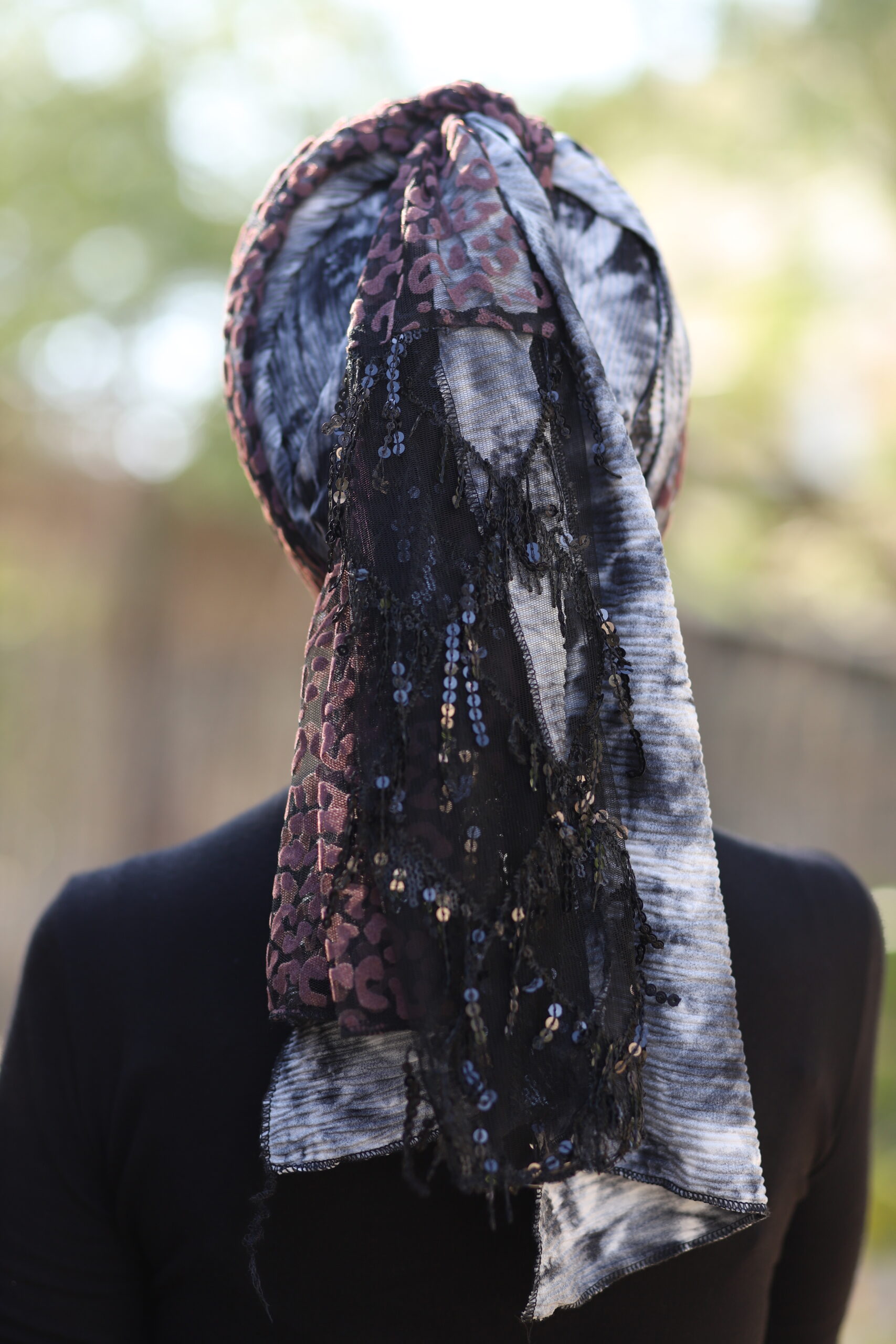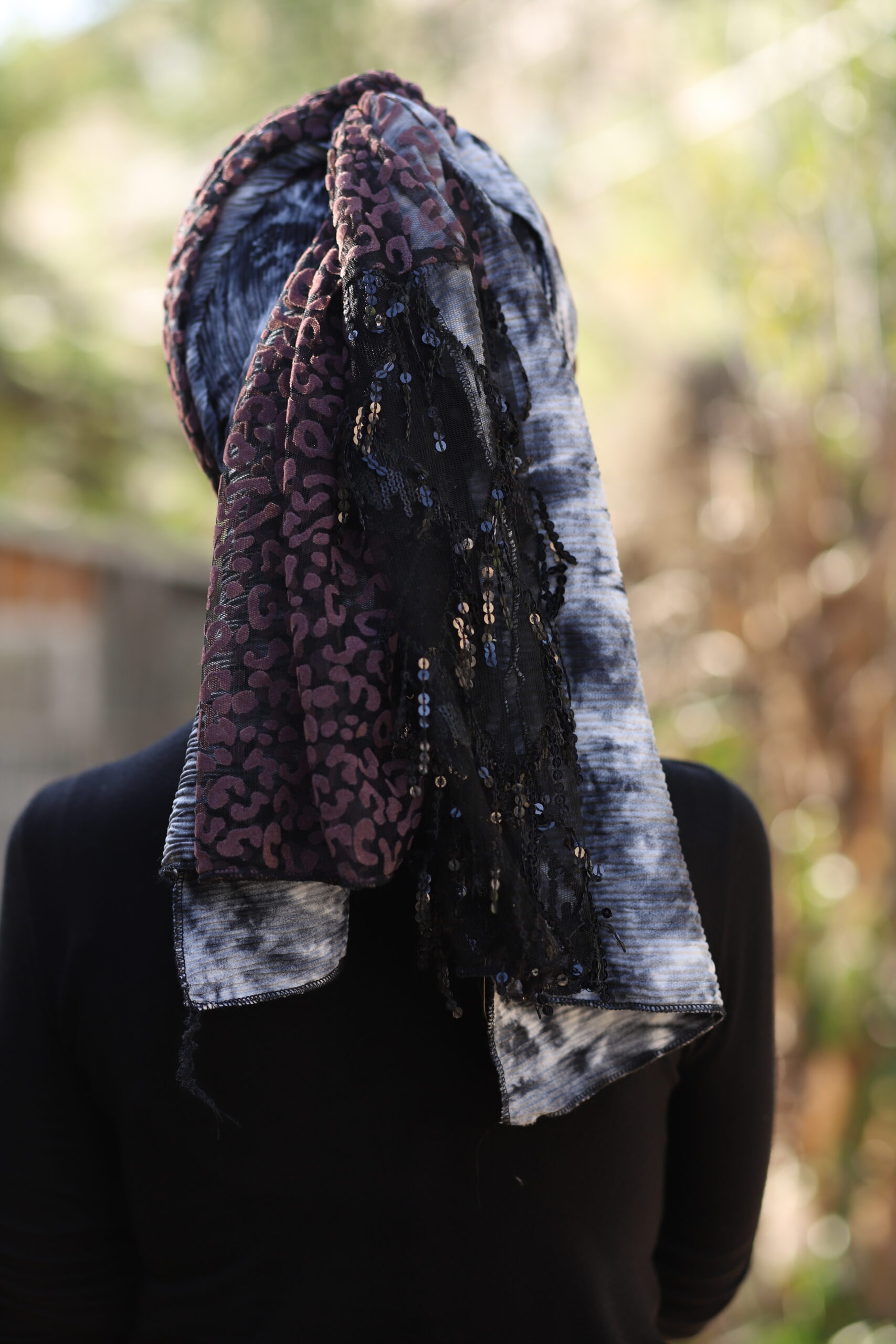 מטפחת נוחה ויפה מבד קטיפה צרובה בגוון סגול ובד אפור עם גוונים. בצד המטפחת בד שיפון עם פייטים נופלים.