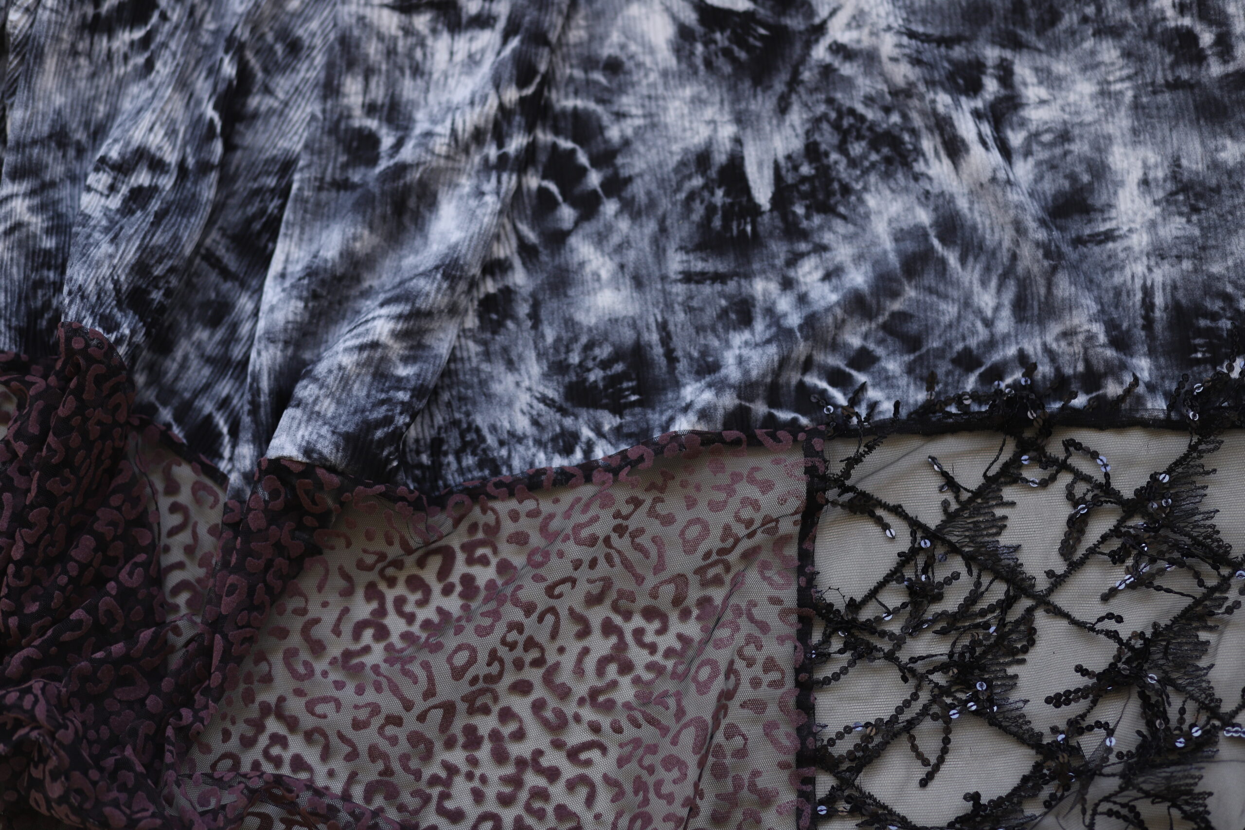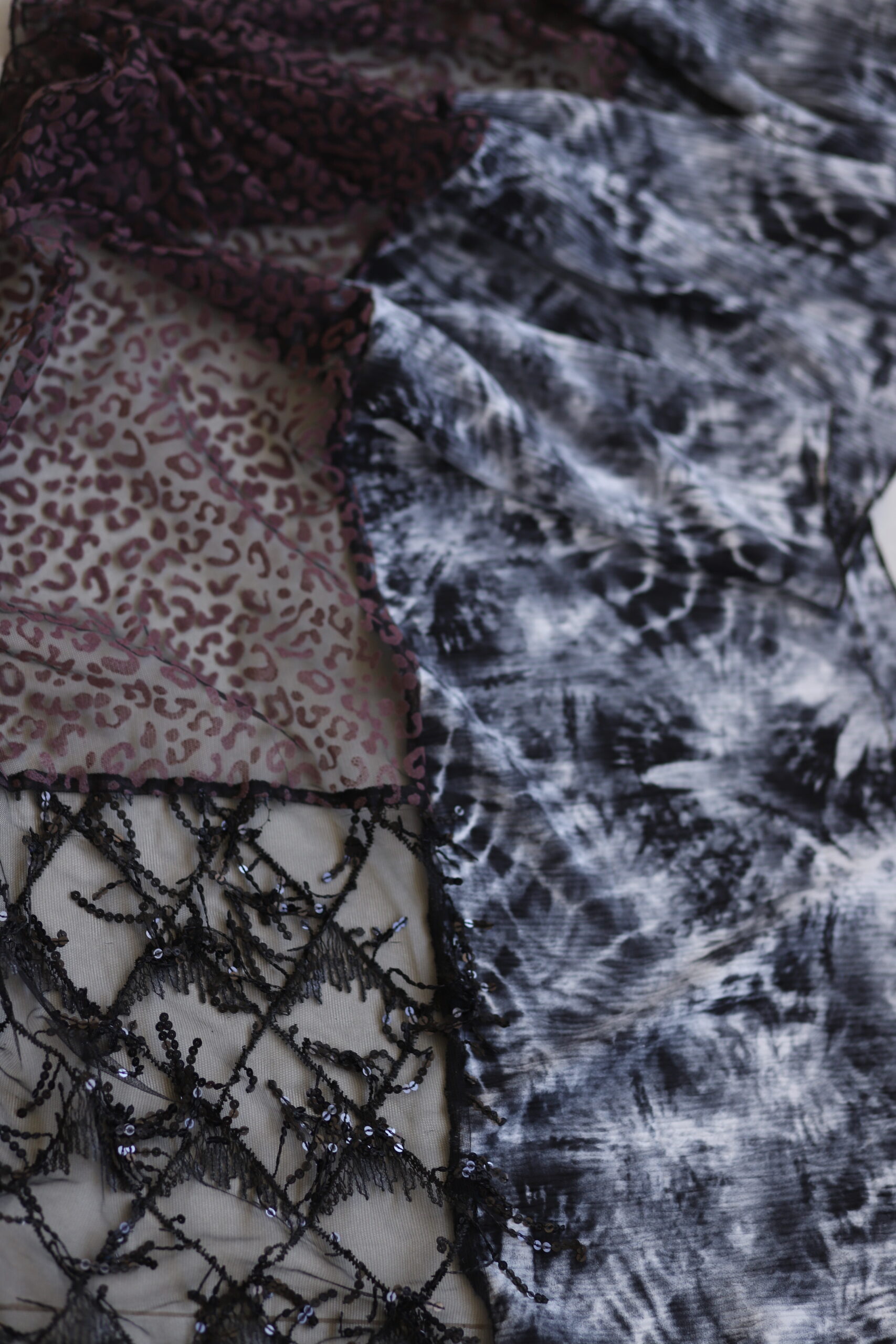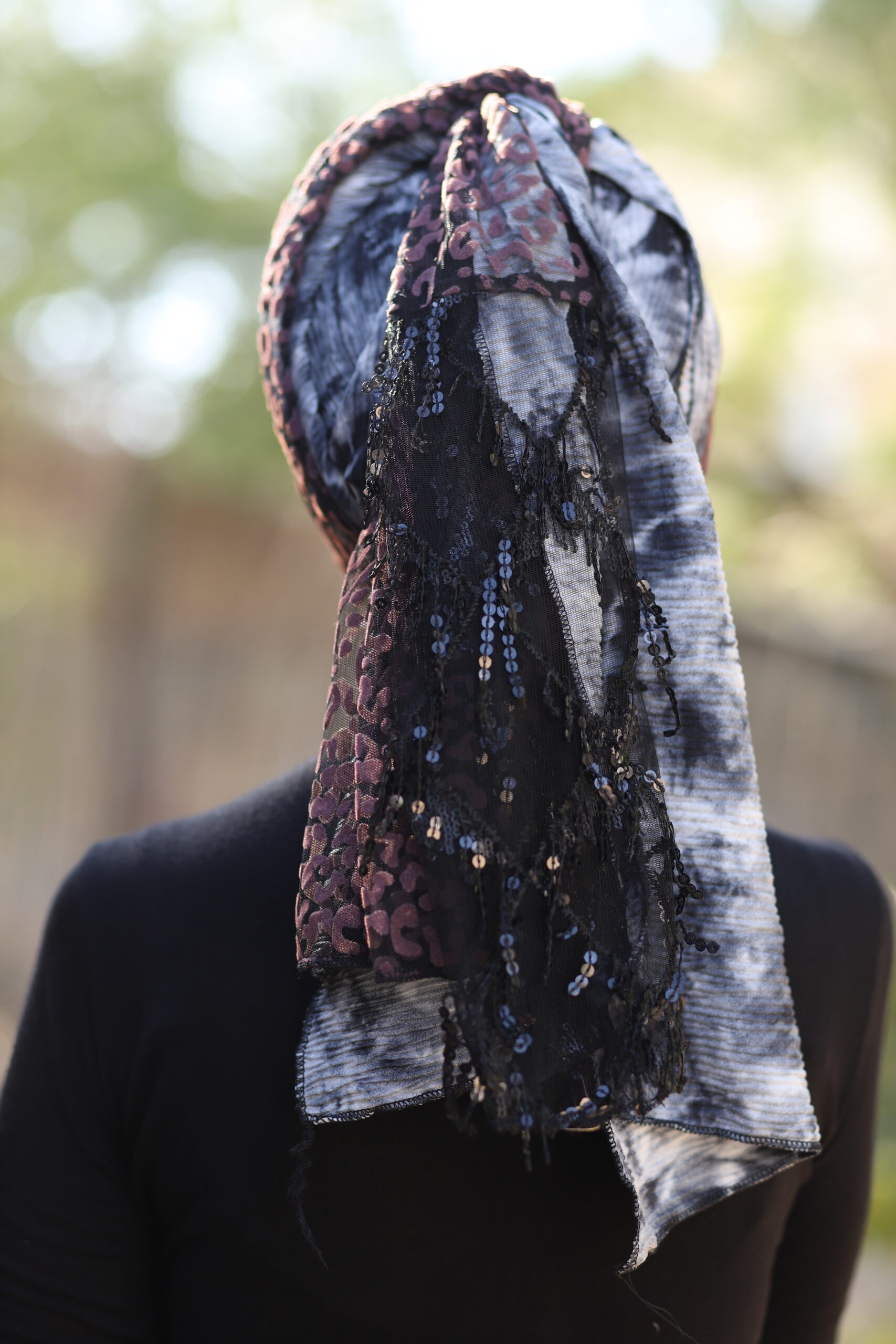 מטפחת נוחה ויפה מבד קטיפה צרובה בגוון סגול ובד אפור עם גוונים. בצד המטפחת בד שיפון עם פייטים נופלים.