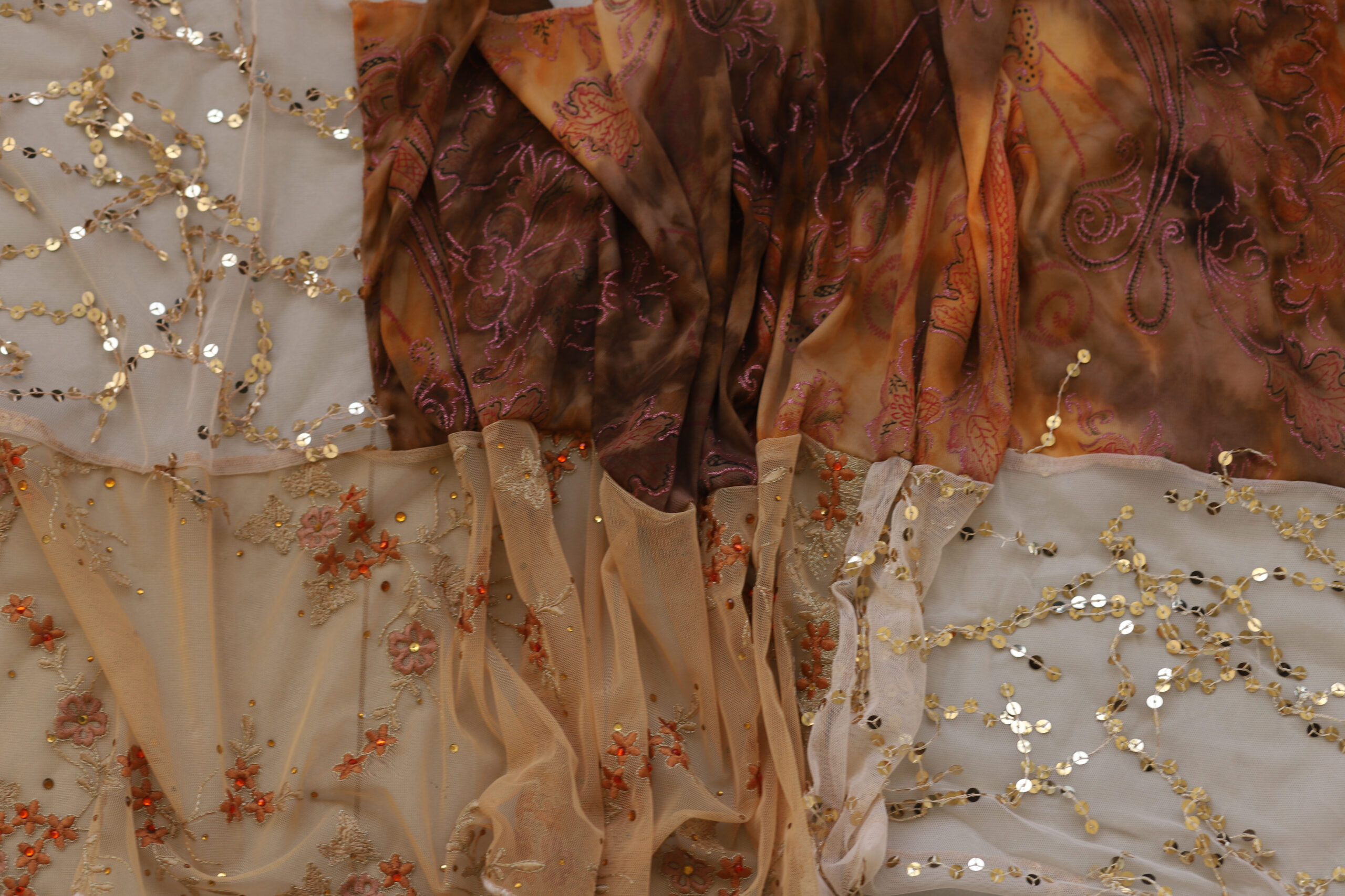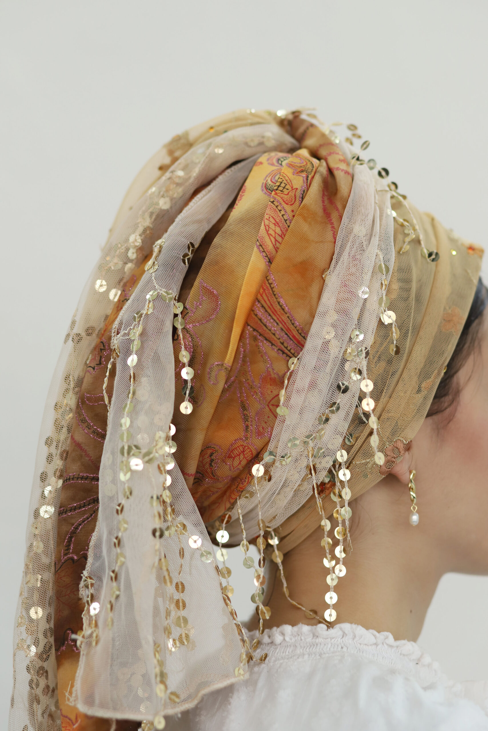 מטפחת חגיגית ומיוחדת המורכבת משני בדים. בד שיפון מיוחד עם ריקמה ופייטים ובד נעים בגוונים דומים. בשני צידי המטפחת בד שיפון עם פייטים נופלים לתוספת יופי בקשירה.