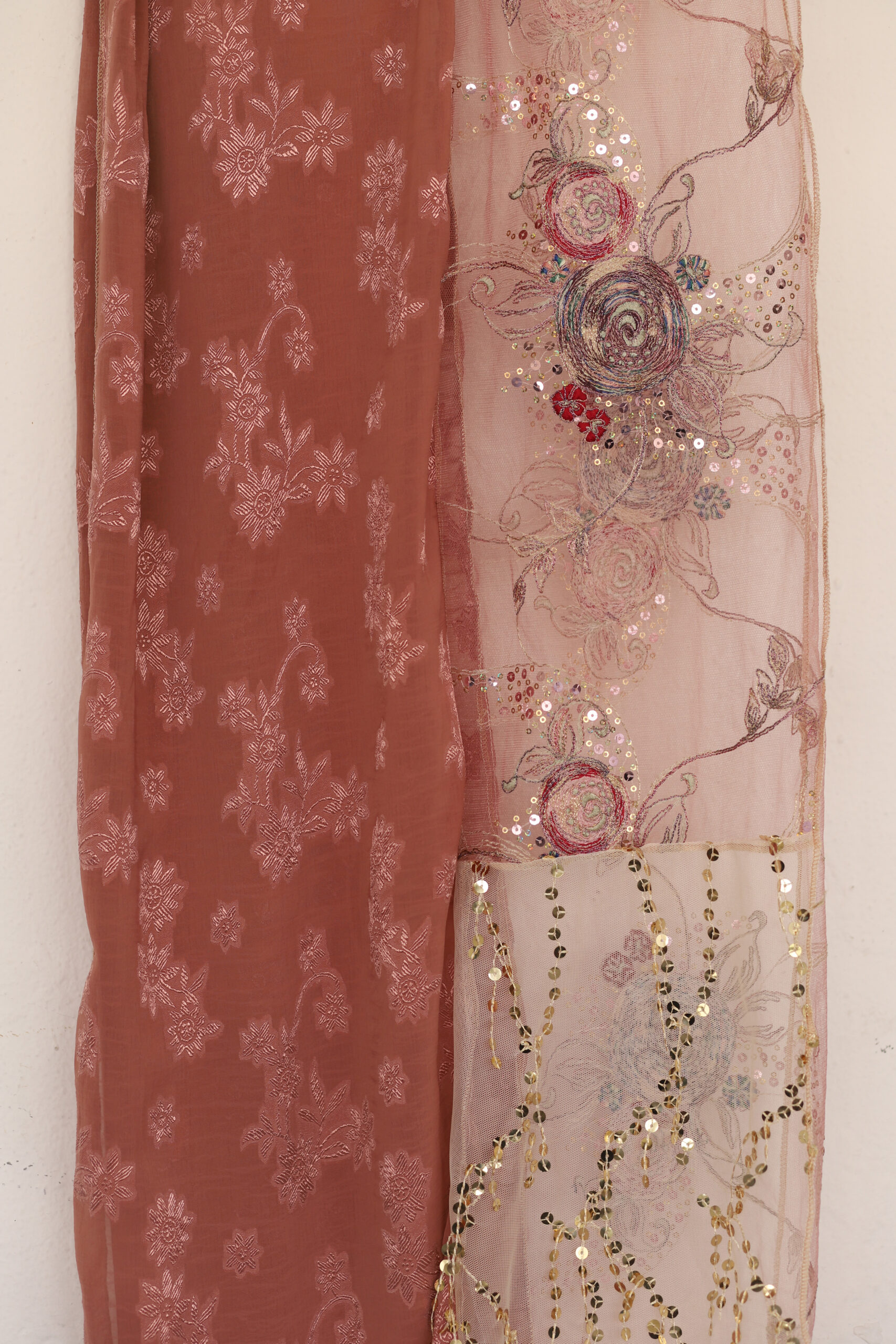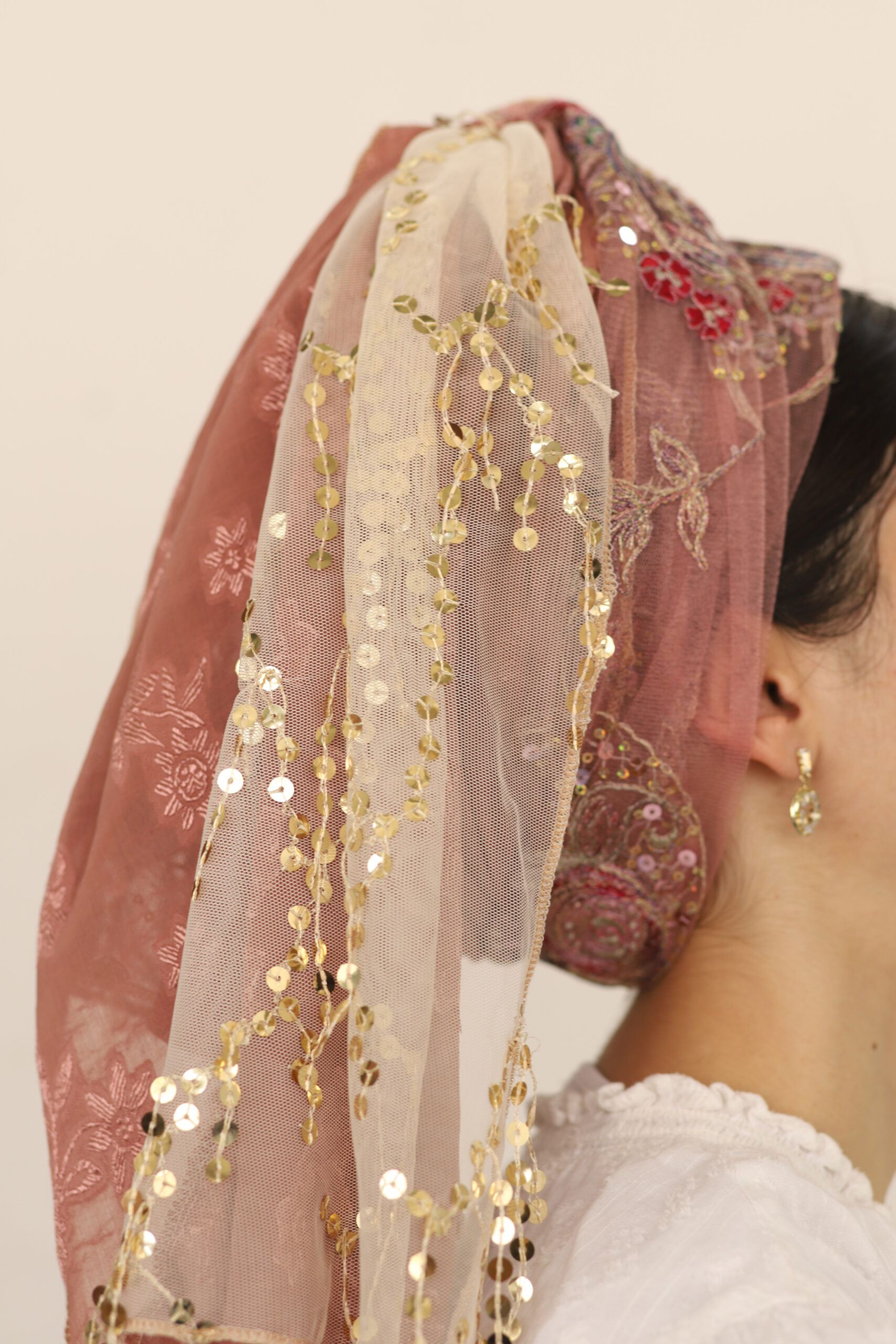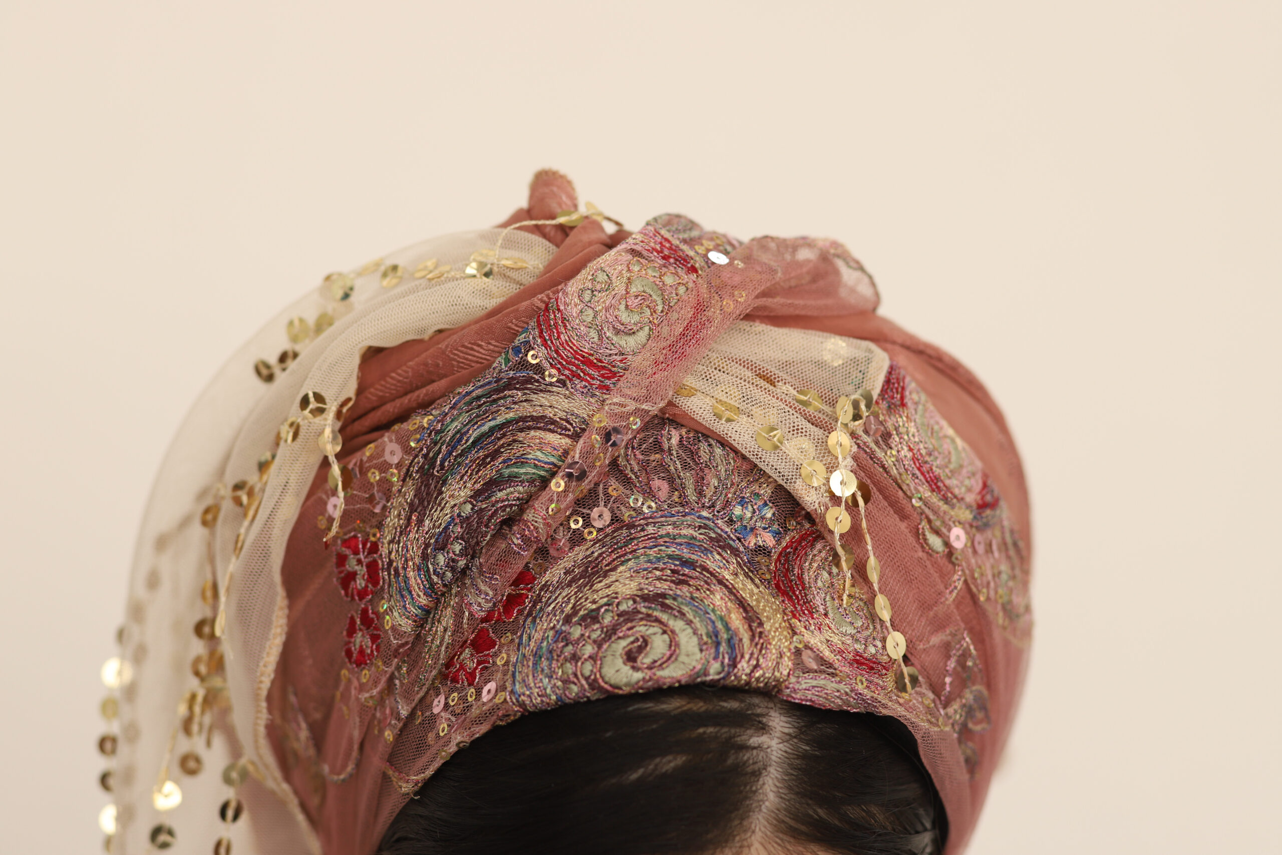 בצד המטפחת בד שיפון עם פייטים נופלים לתוספת יופי ומיוחדות בקשירה.