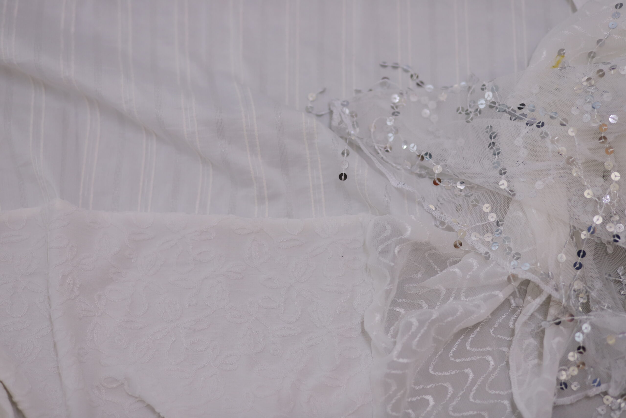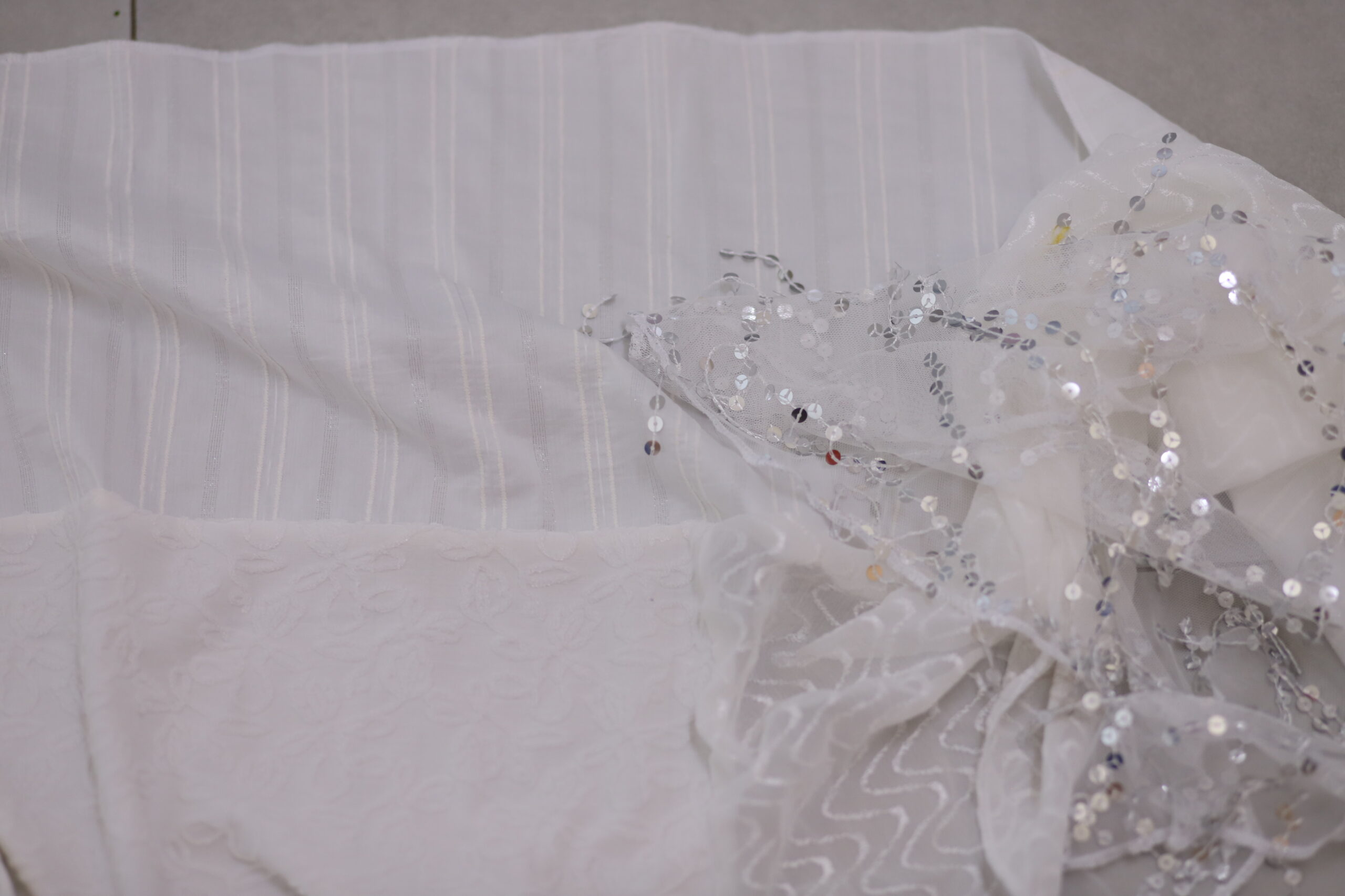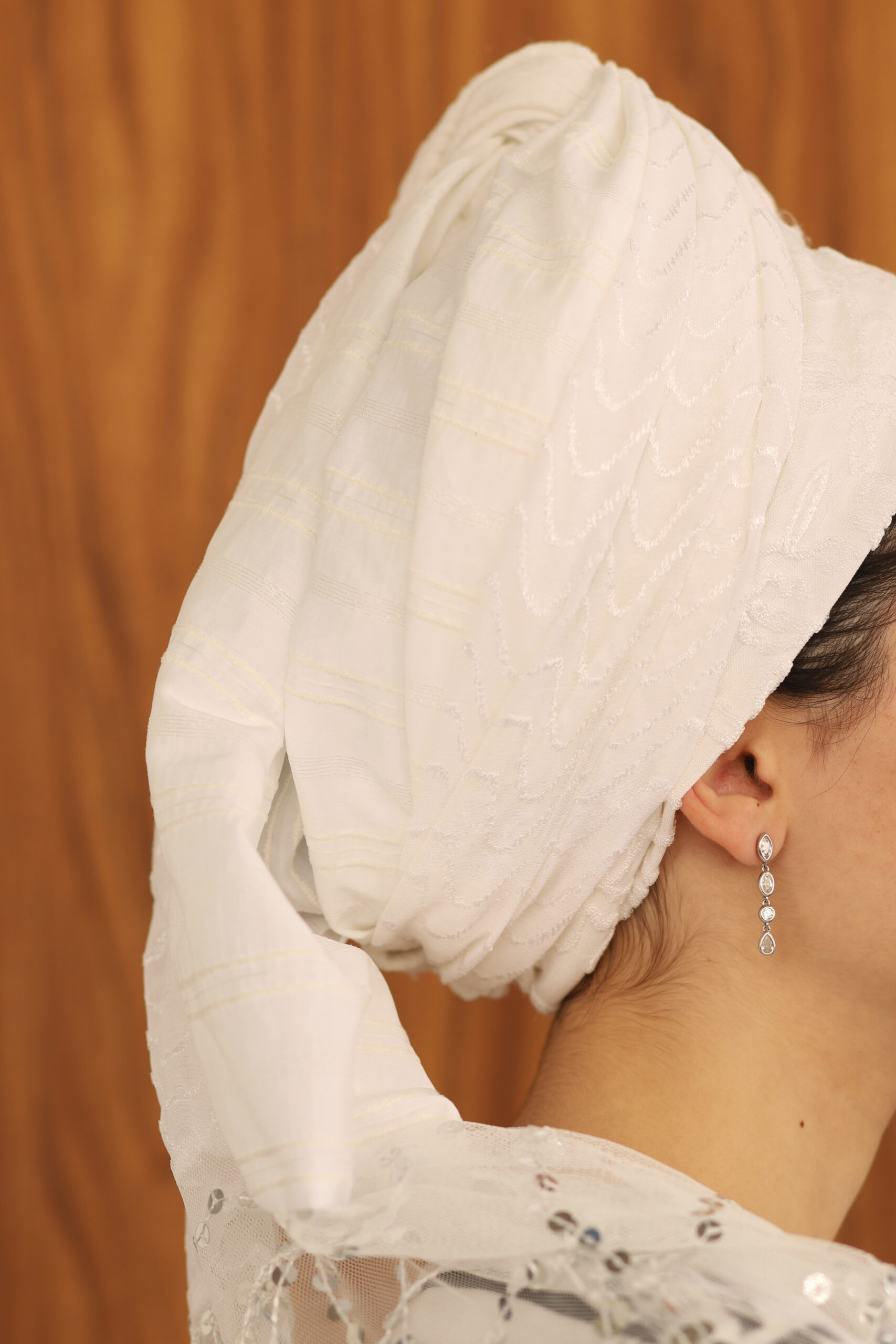 מטפחת לבנה מבד שיפון מדוגם, בד עם ריקמה מיוחדת ובד כותנה עם פסים כסופים. בצד המטפחת בד שיפון עם פייטים נופלים לתוספת יופי בקשירה.