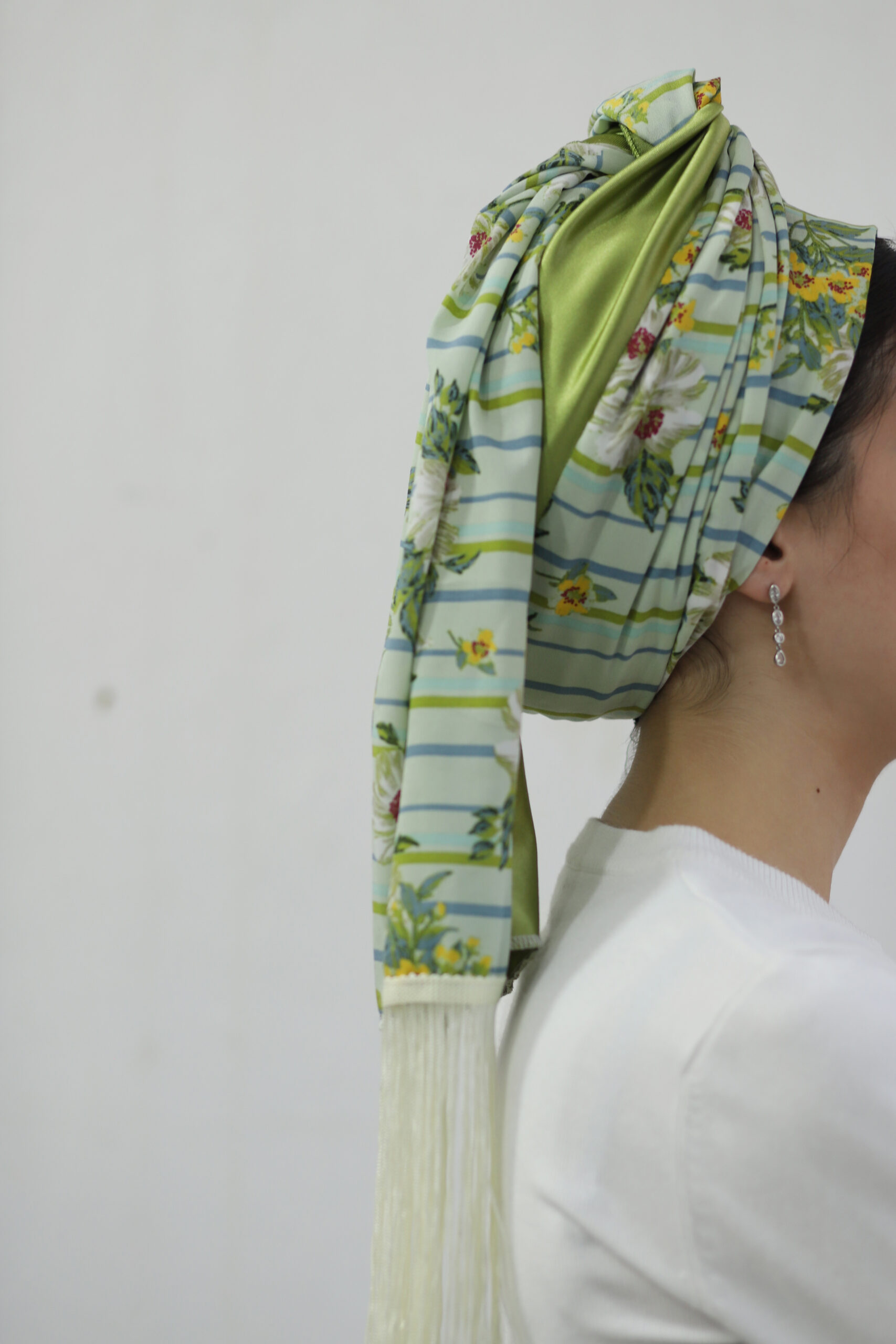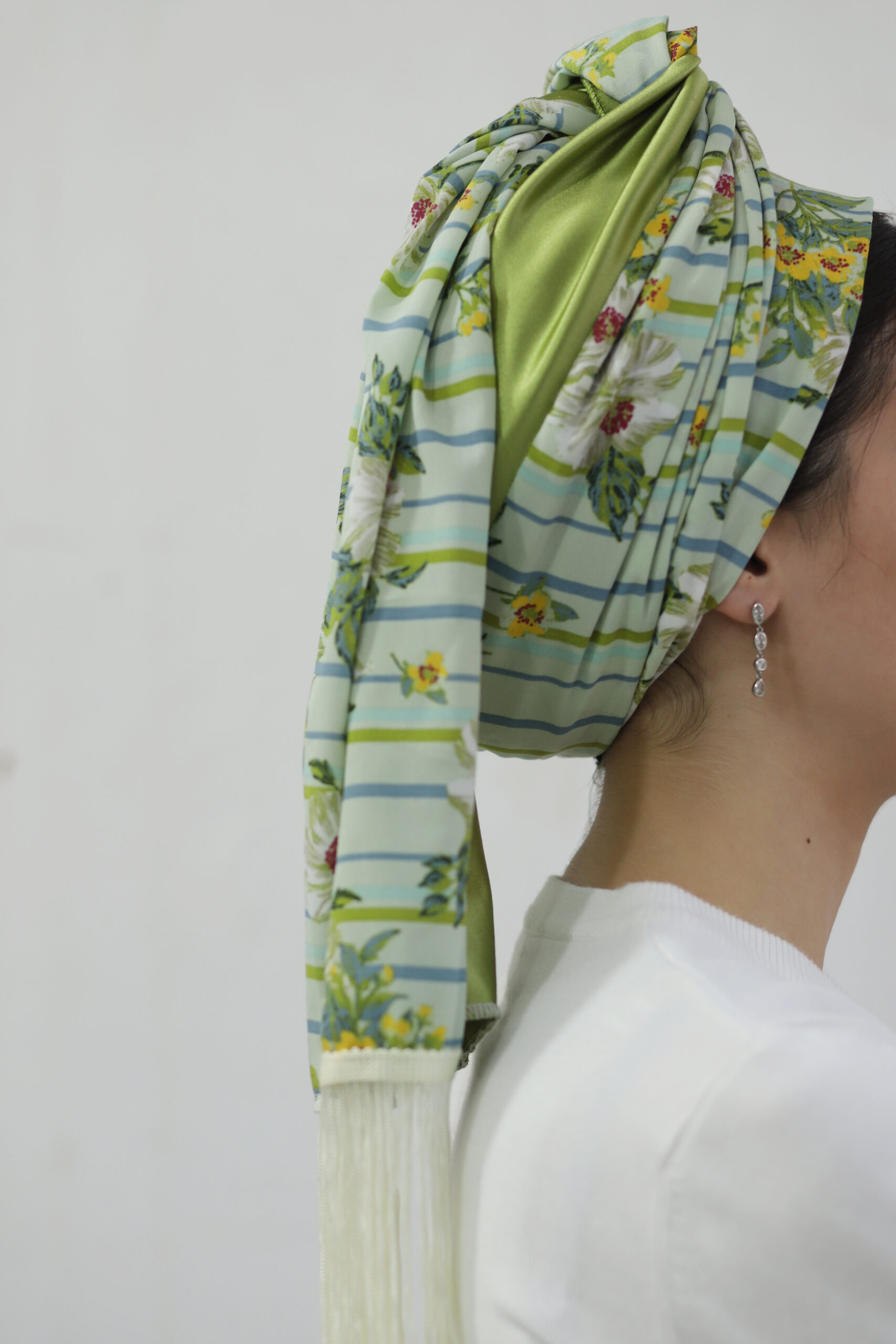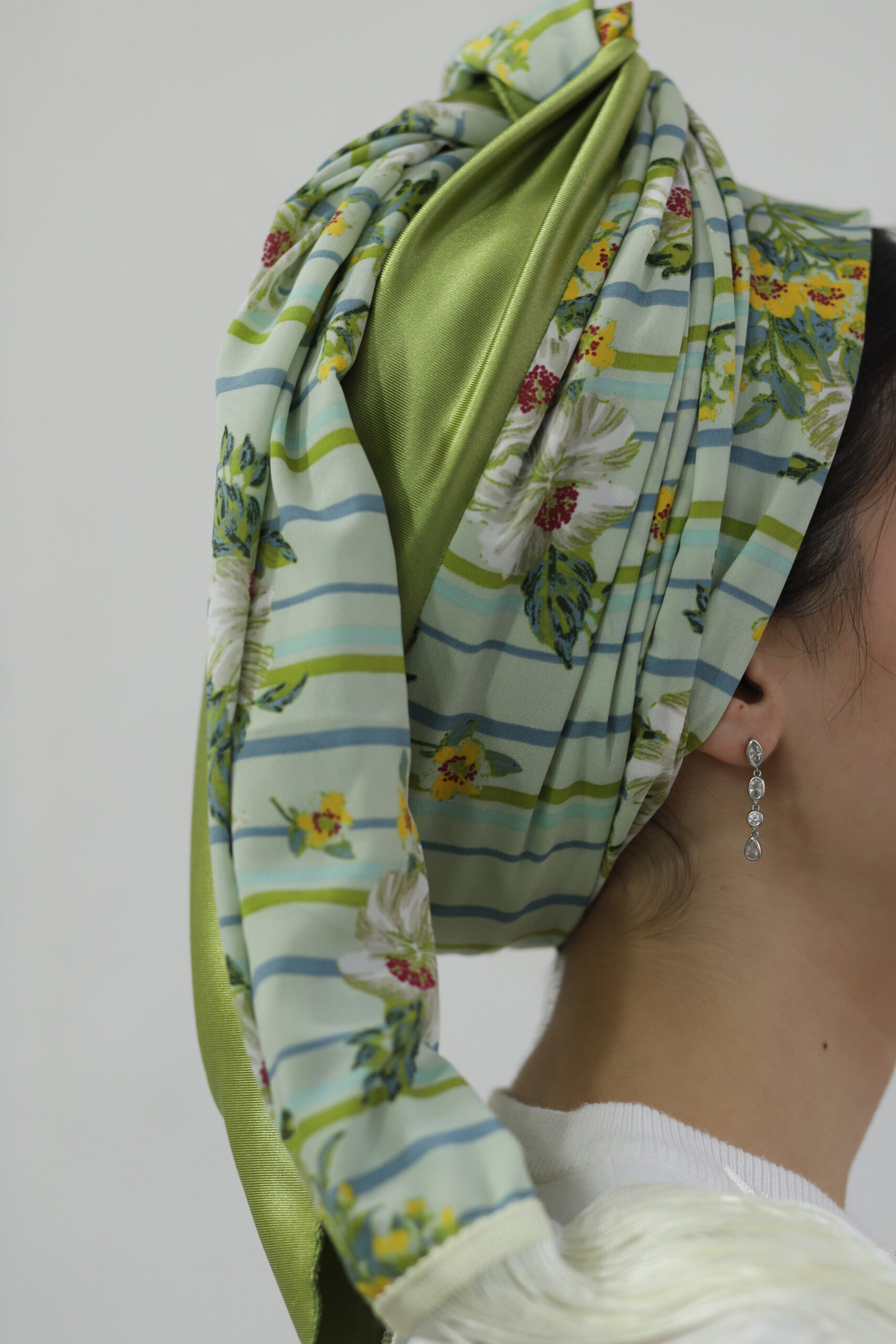 מטפחת המורכבת משני בדים בד סאטן ארמני ובד ויסקוזה פרחוני.