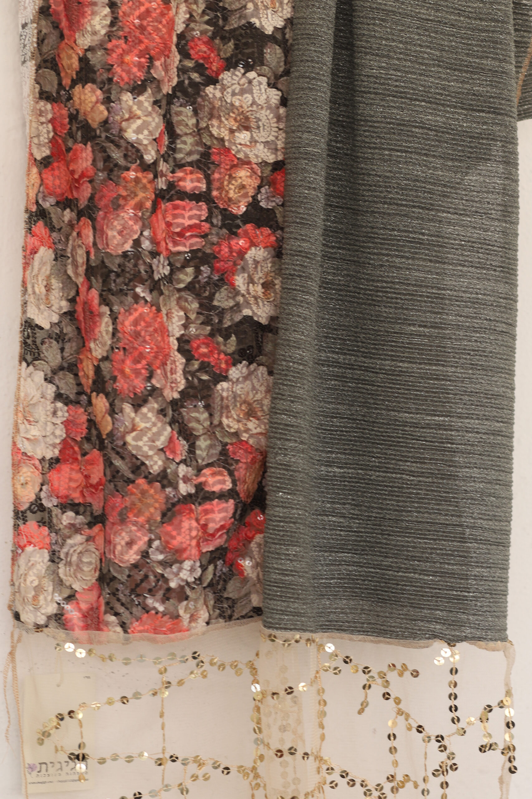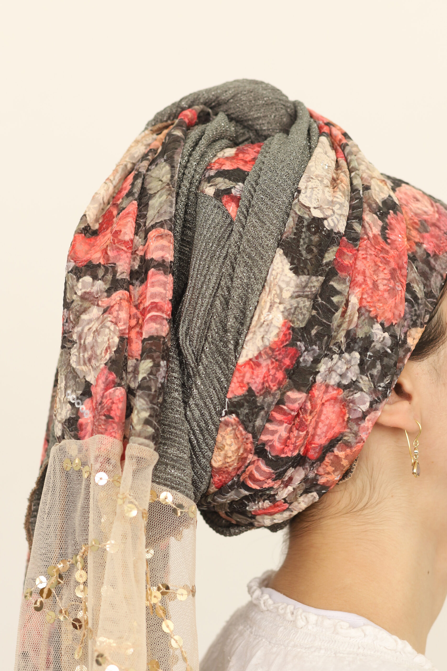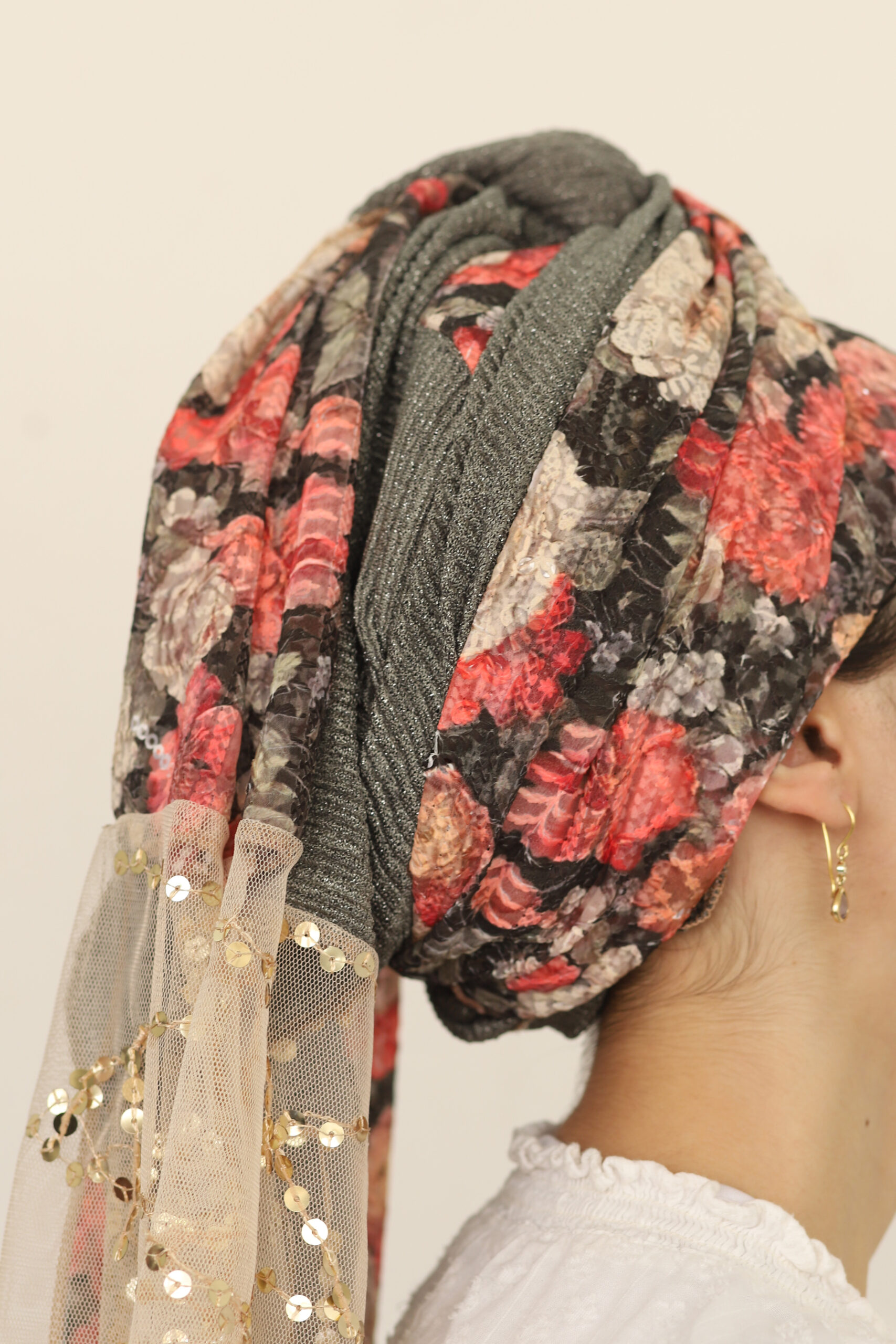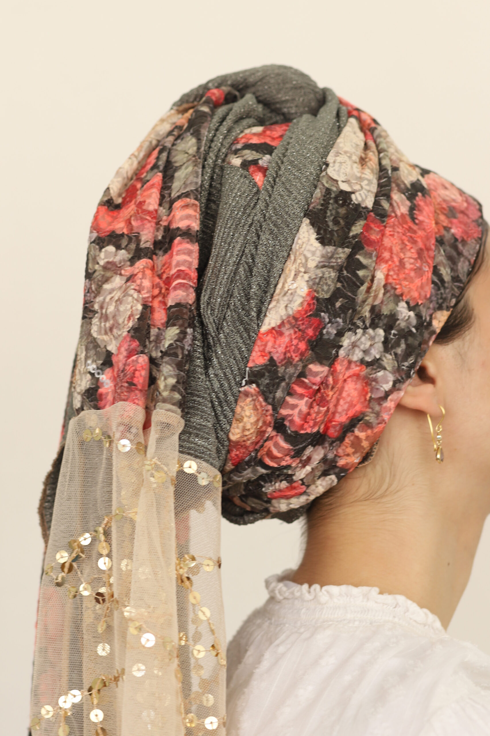 מטפחת מהממת מבד פרחוני מיוחד ובד פליסה בגוון תואם. בצד המטפחת בד שיפון עם פייטים נופלים לתוספת יופי בקשירה.