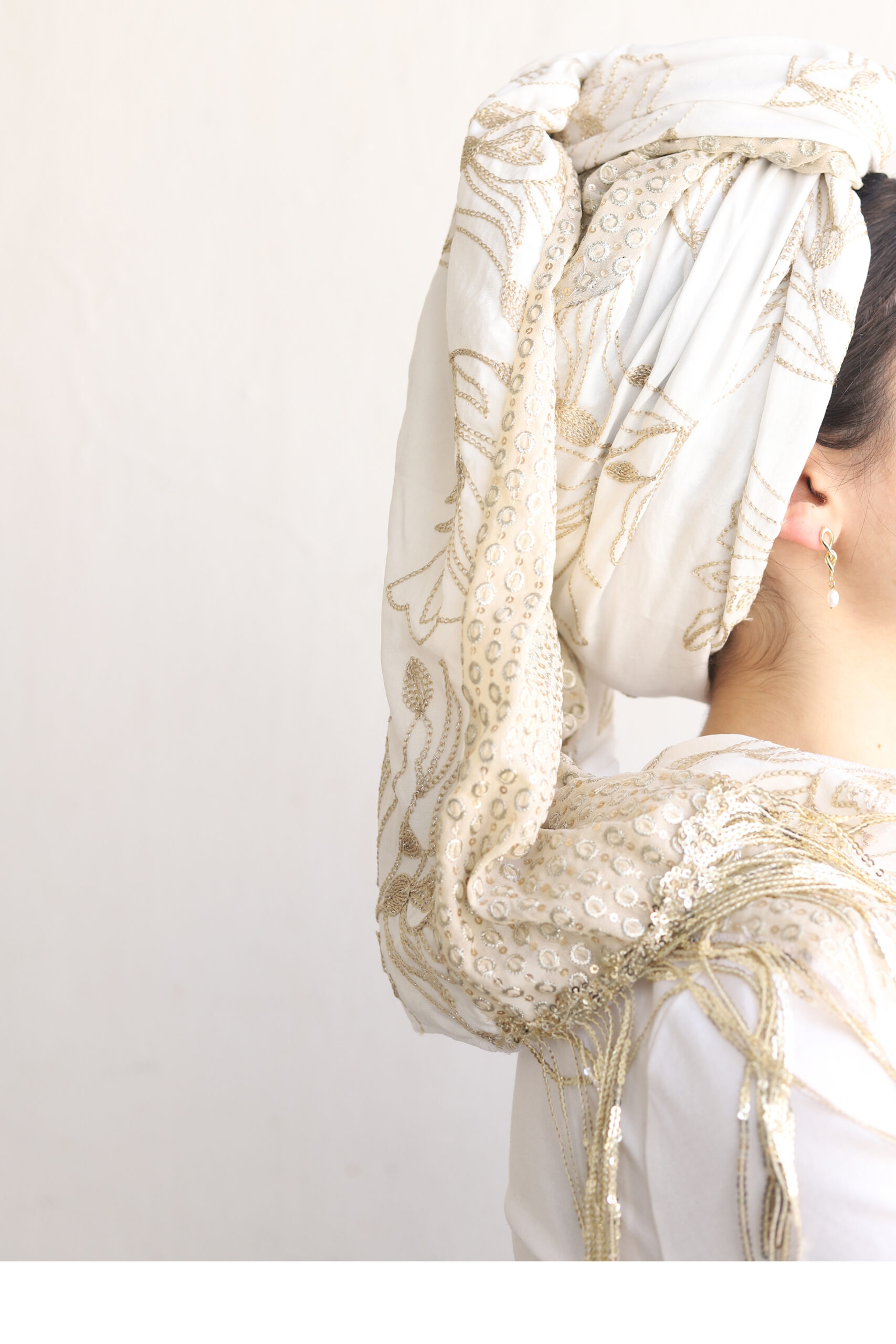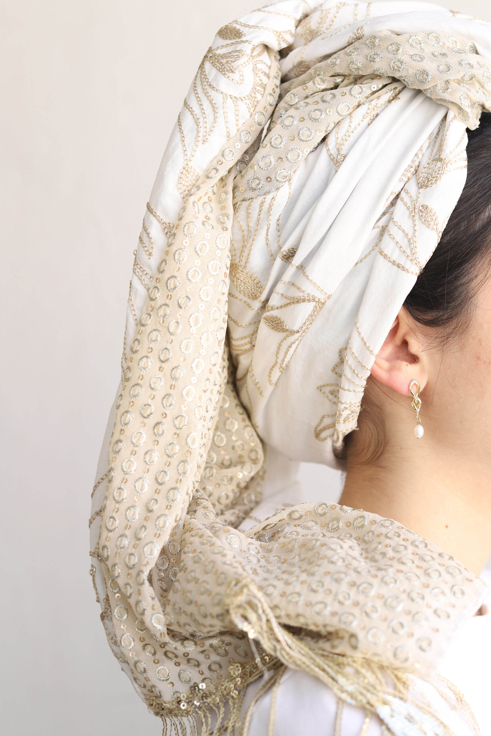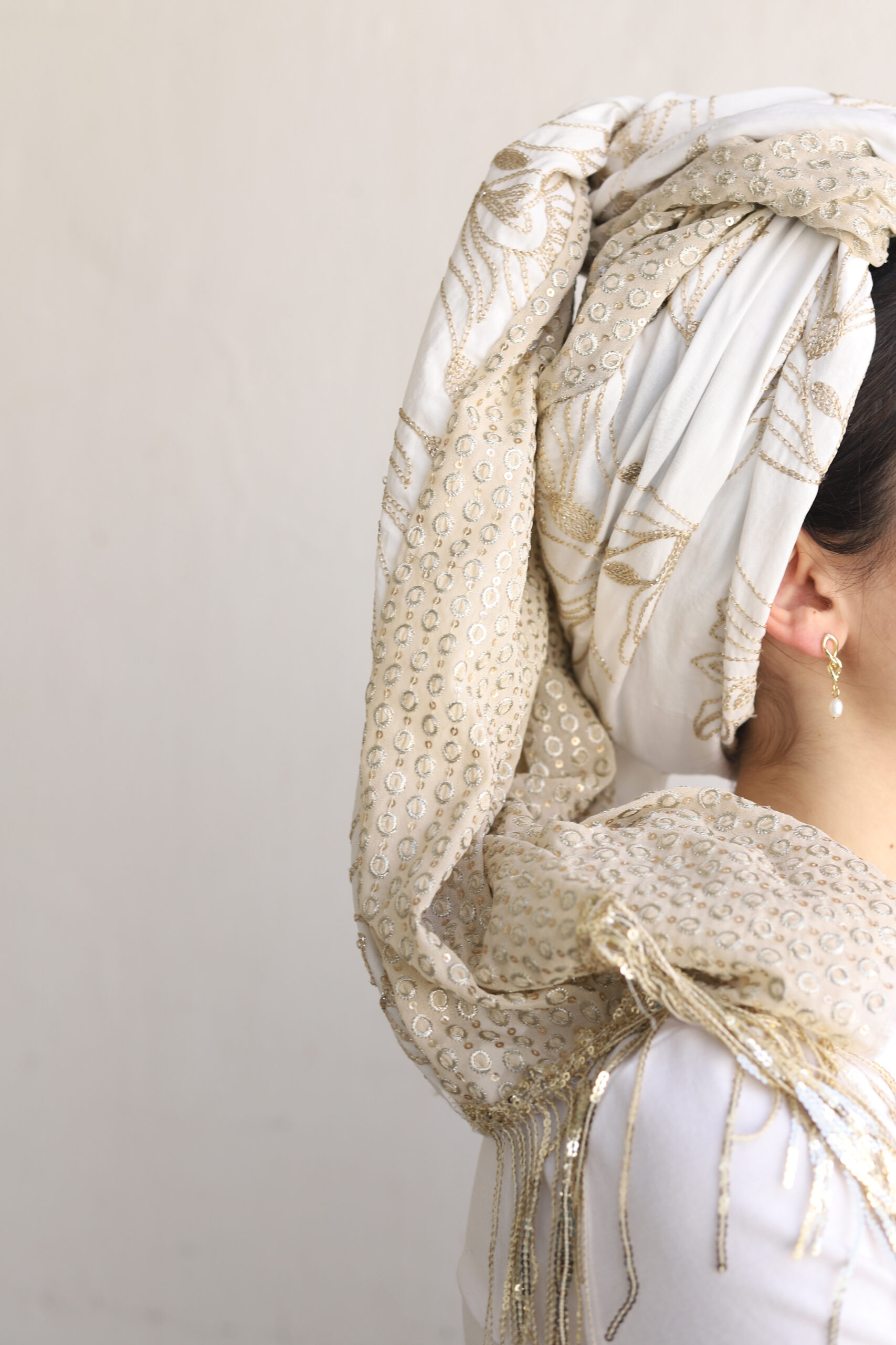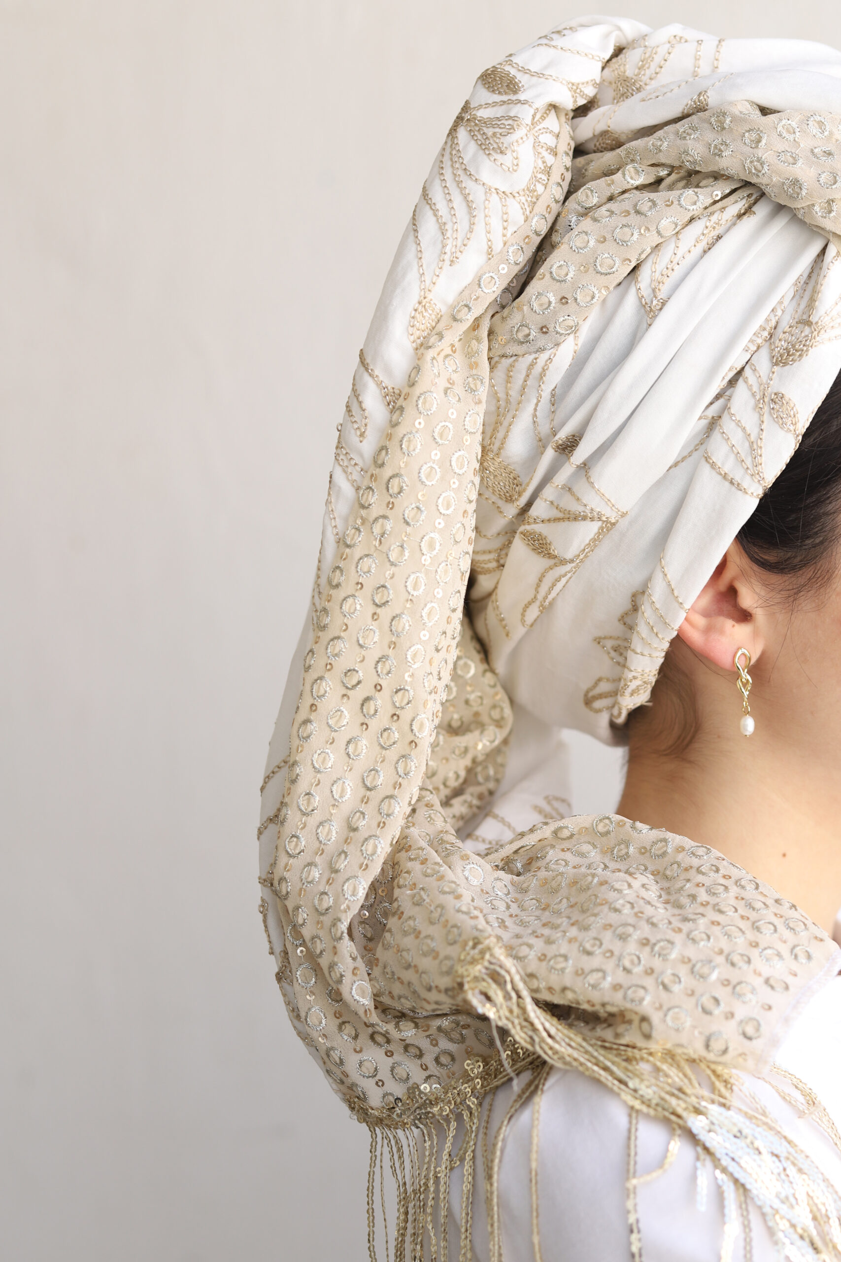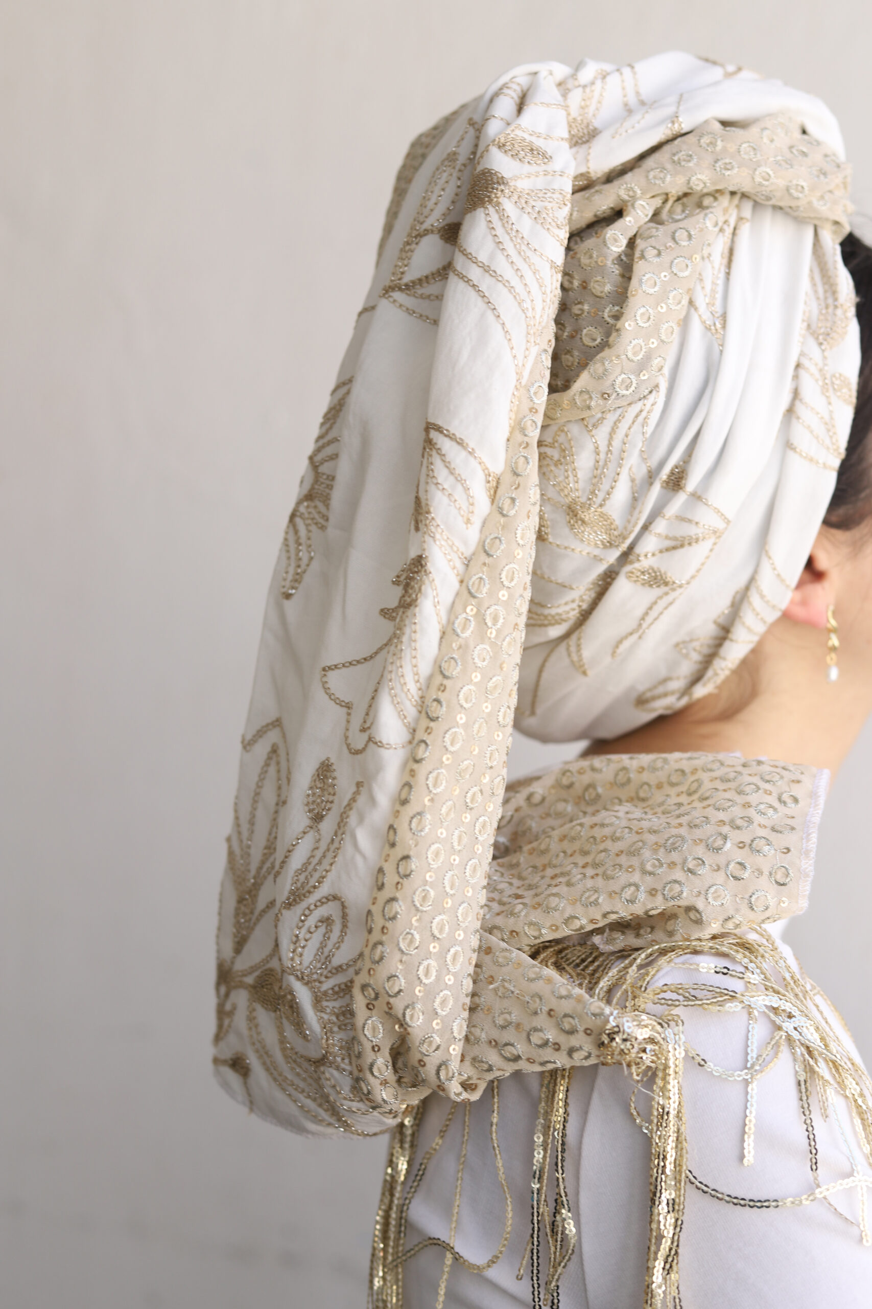 מטפחת לבנה חגיגית המורכבת משני עולמות של יוקרה. צד אחד בבד מוזהב עשיר שמעניק ברק ונוכחות, וצד שני בבד לבן צחור עם רקמת זהב עדינה ומדויקת. השילוב בין המרקמים יוצר קשירה בעלת נפח מרשים ומראה יוקרתי במיוחד. המטפחת המושלמת לליל הסדר, לשבתות חגיגיות ולכל אירוע שבו את רוצה להרגיש הכי מיוחדת שיש.