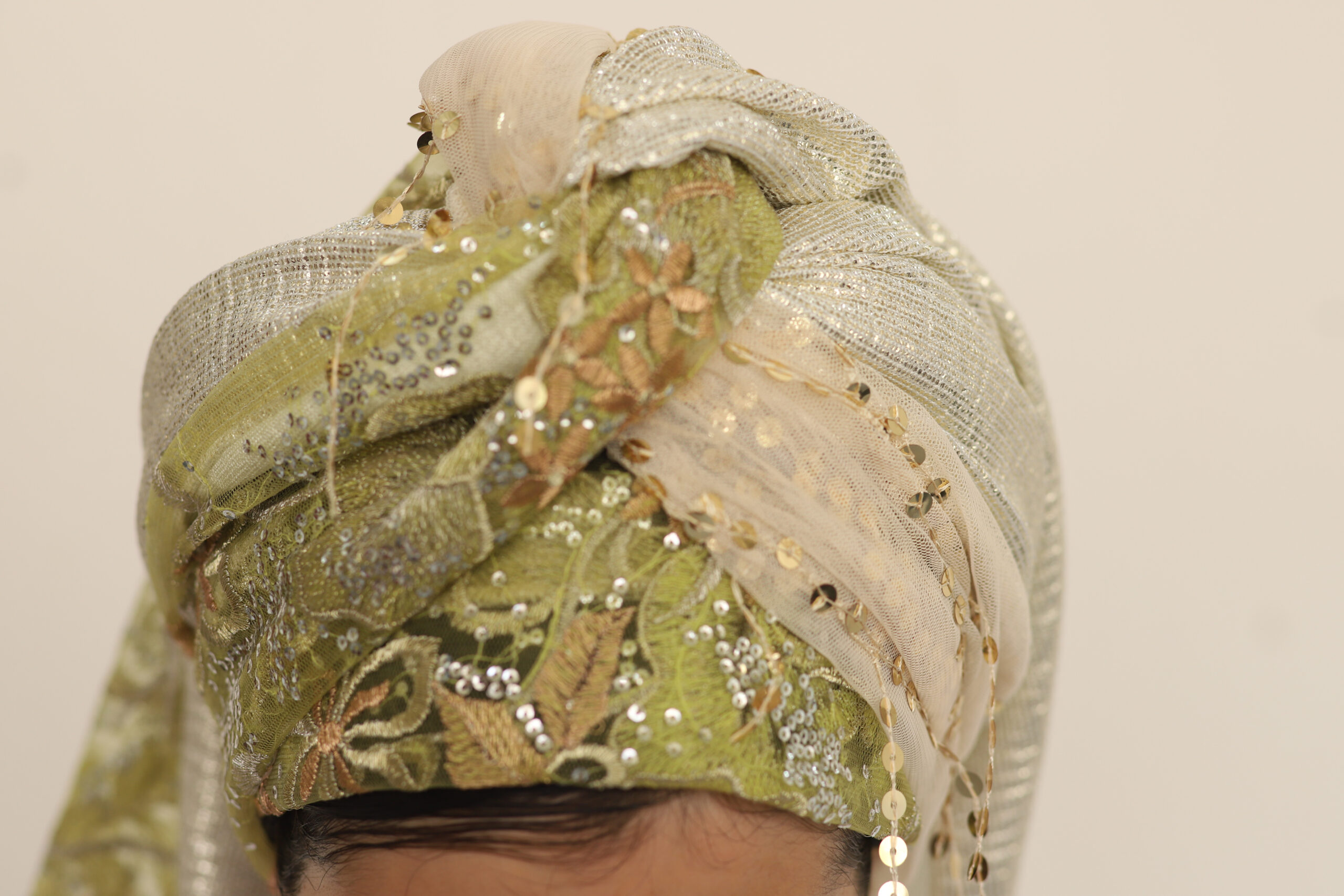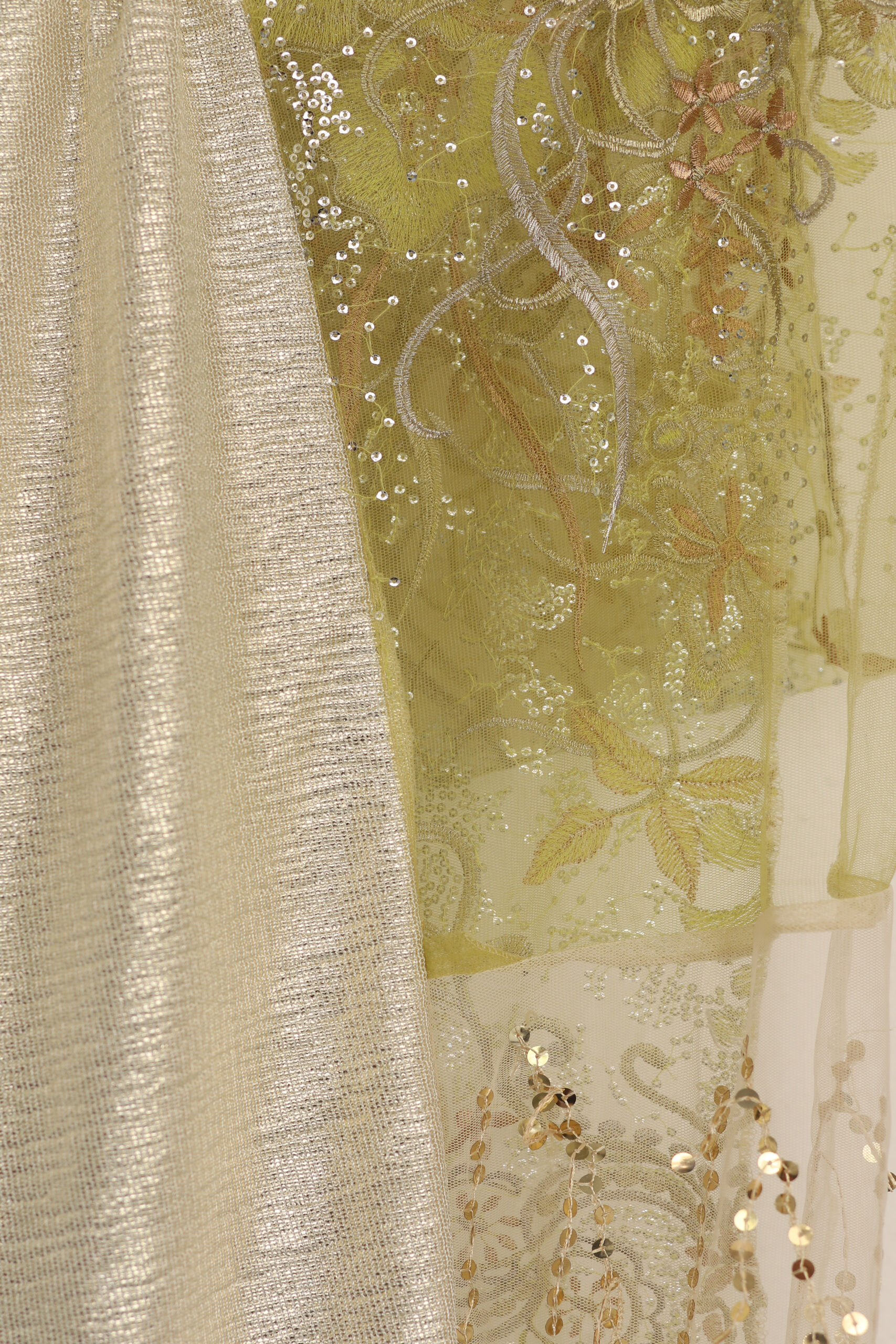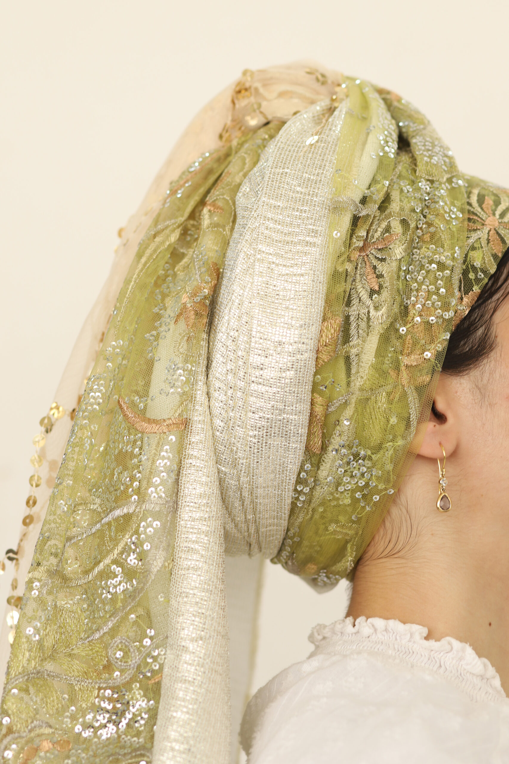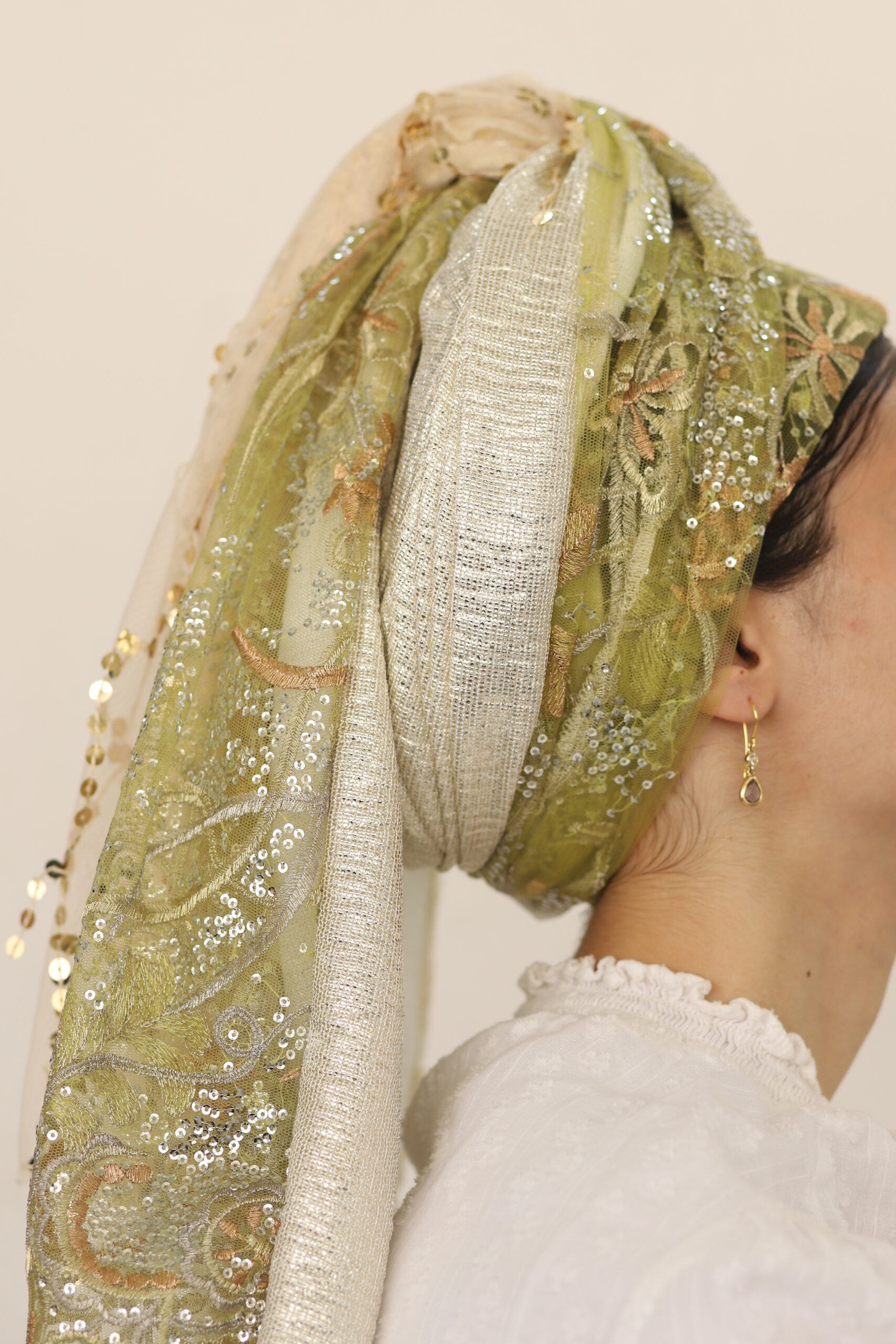 מטפחת זו היא יצירת אמנות של צבע, מרקם ויוקרה. בד ברוקרד בצבע זהב בהיר בשילוב בד תחרה מושלם. .פריט חגיגי שמעניק לכל הופעה טאץ’ של אלגנטיות ייחודית.