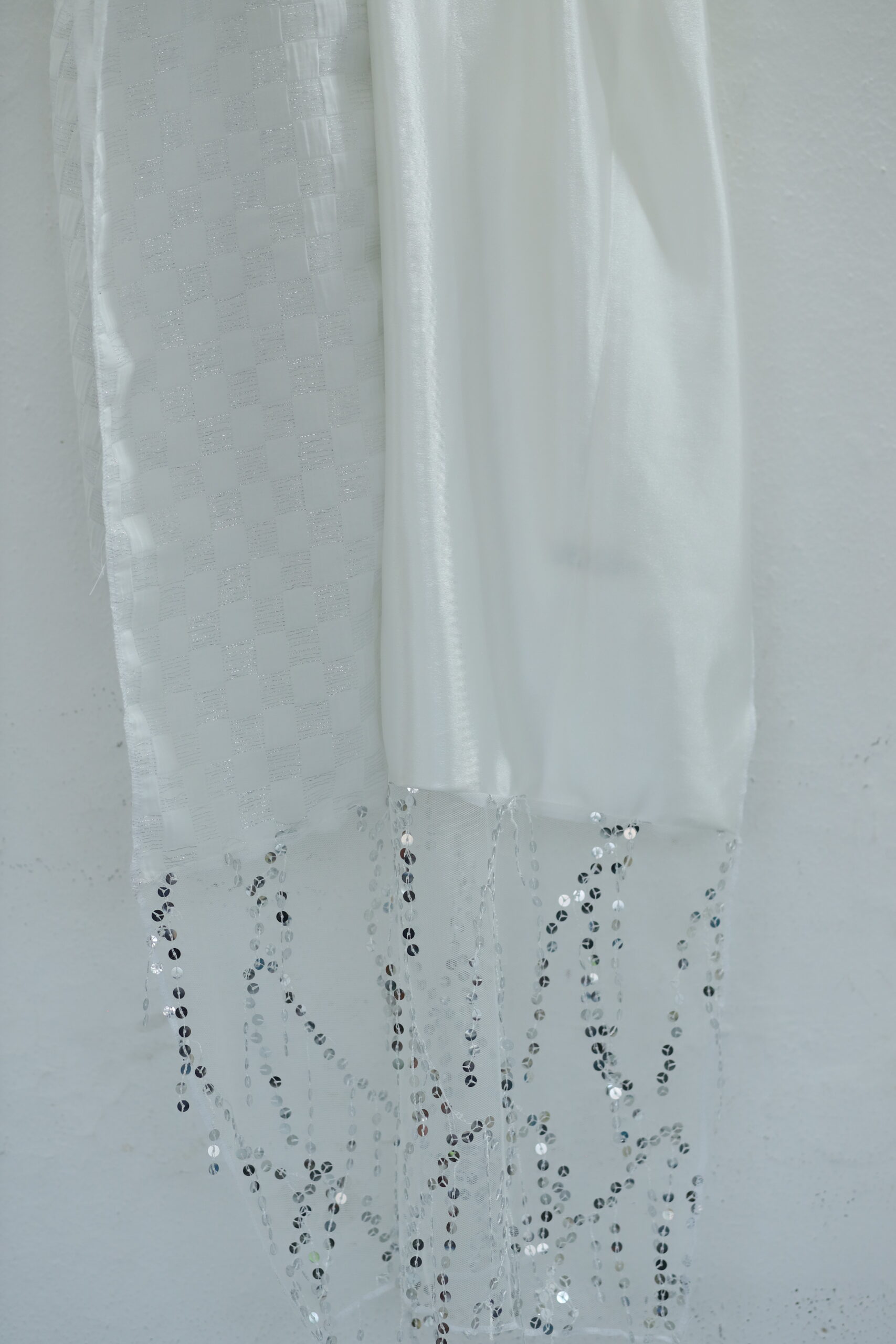 מטפחת מבד סאטן ארמני בצבע לבן ובד מדוגם בצבע לבן עם עיטורי כסף עדינים . בצד המטפחת בד שיפון עם פייטים כסופים נופלים.