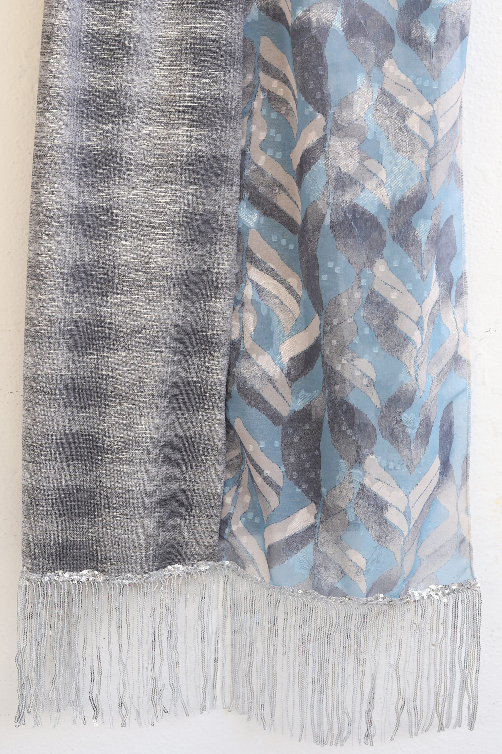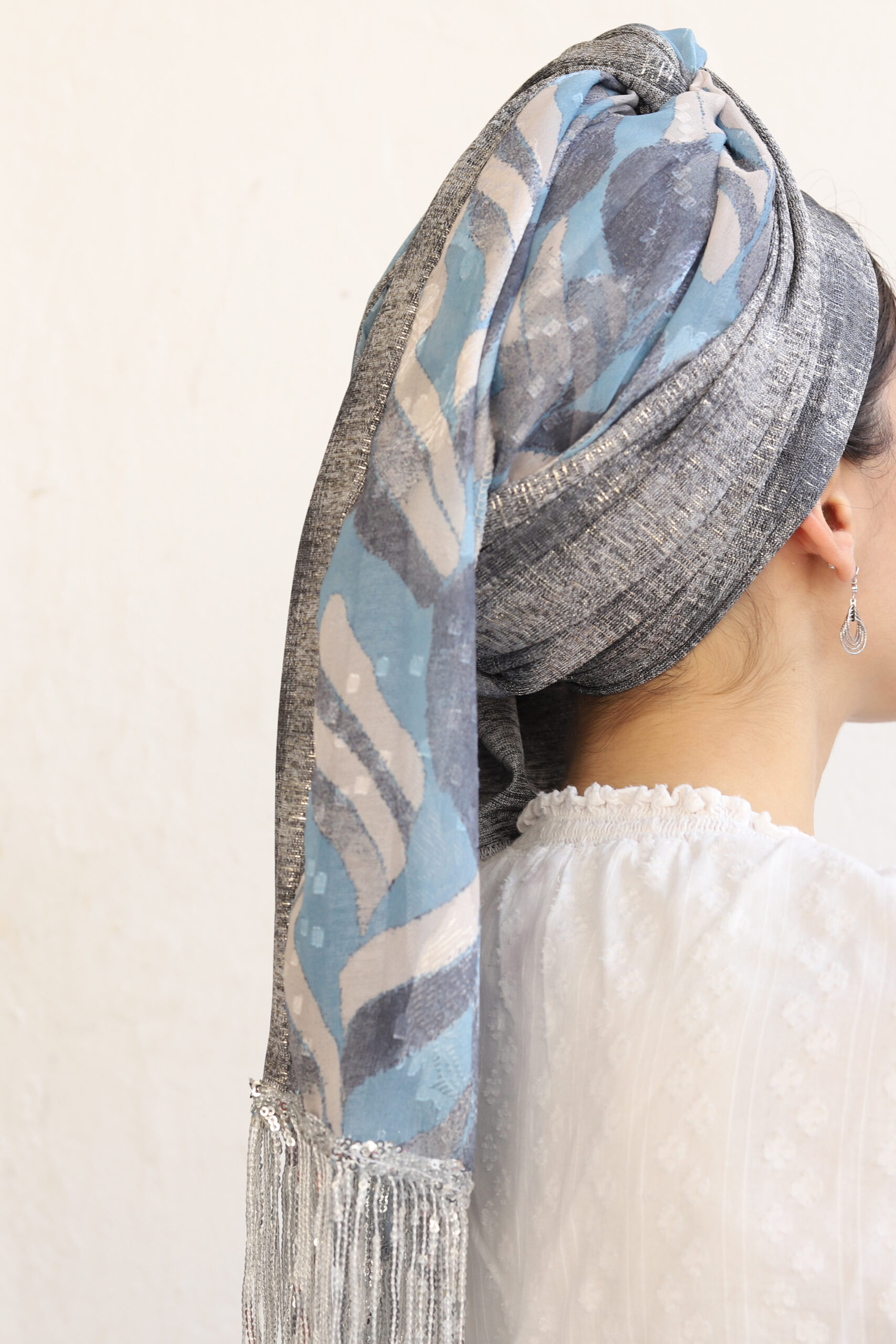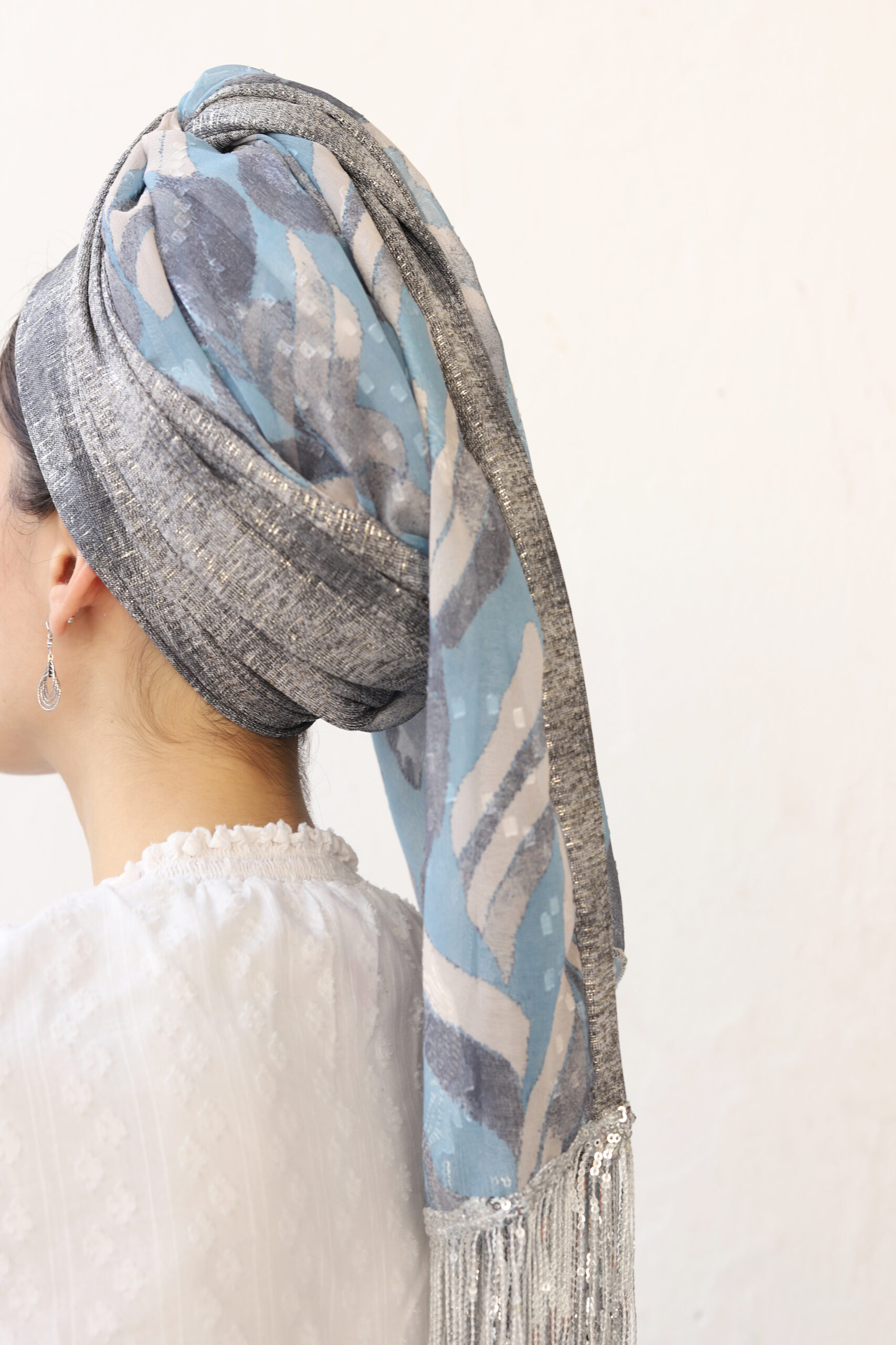 מטפחת מבד שיפון מדוגם ובד אפור תואם. בצד המטפחת סרט עם פייטים נופלים לתוספת יופי ומיוחדות בקשירה.
