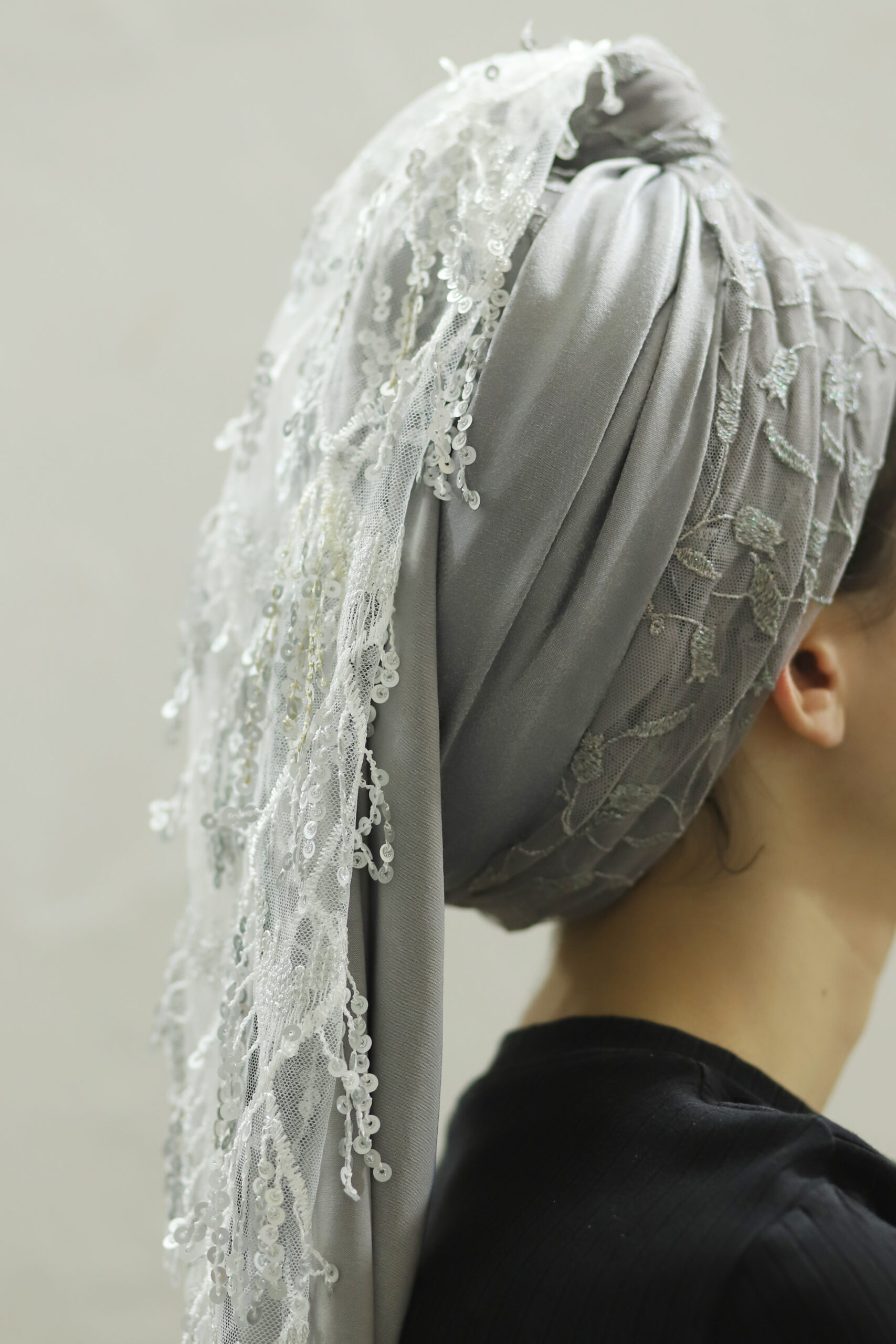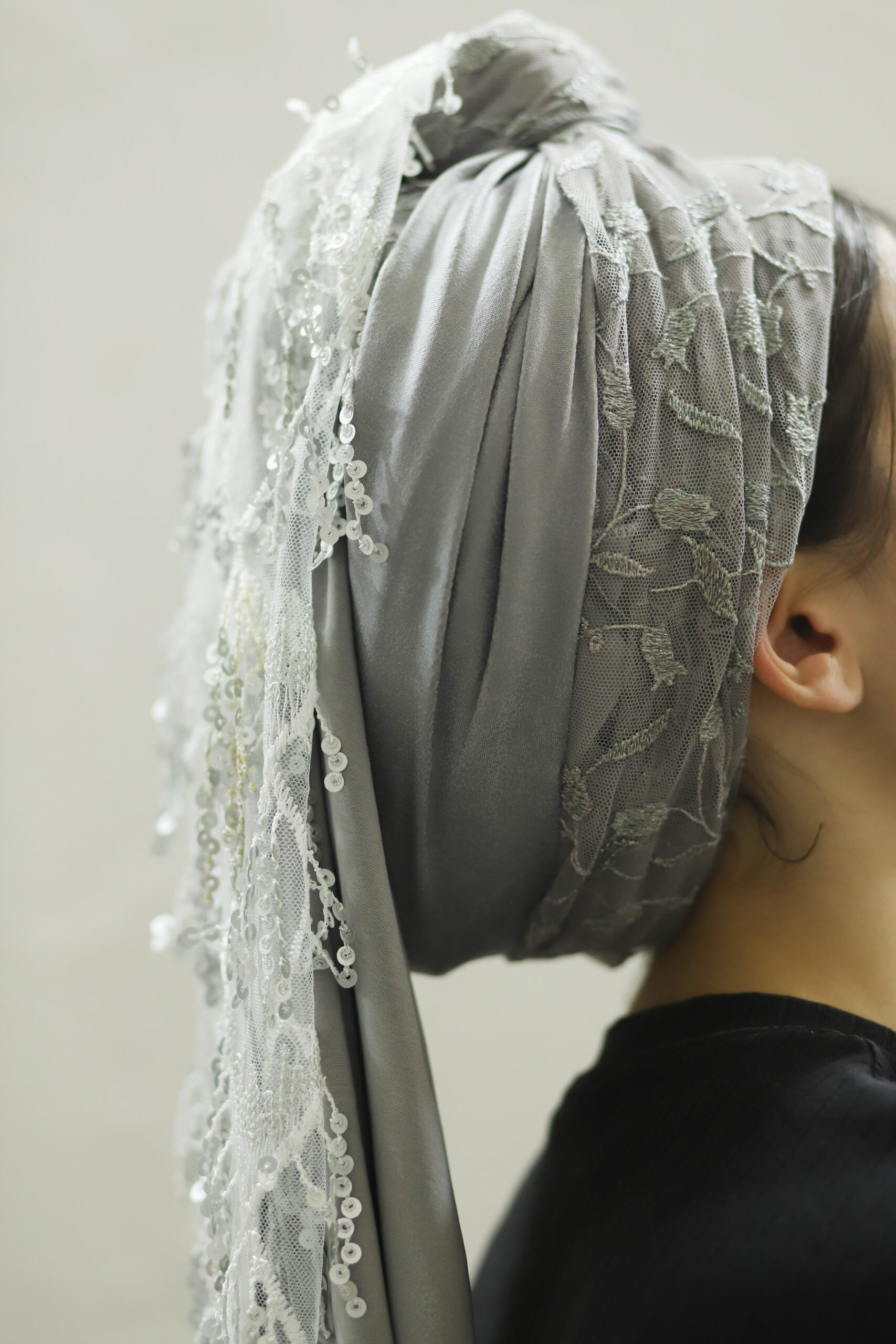 מטפחת אפורה המורכבת מבד אפור חלק, בד עם תחרה מיוחדת ובד שיפון עם פייטים נופלים בגווני אפור ולבן.