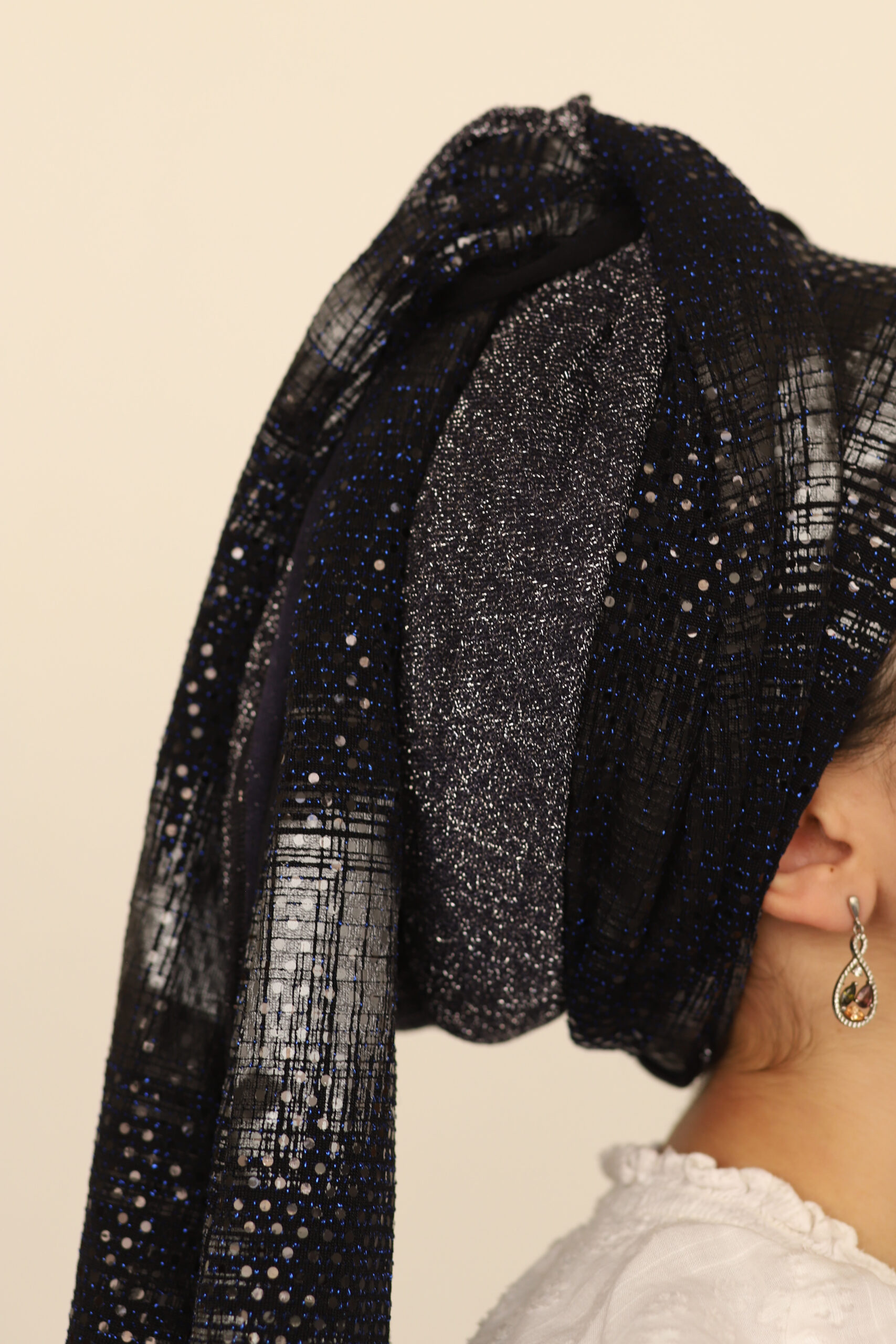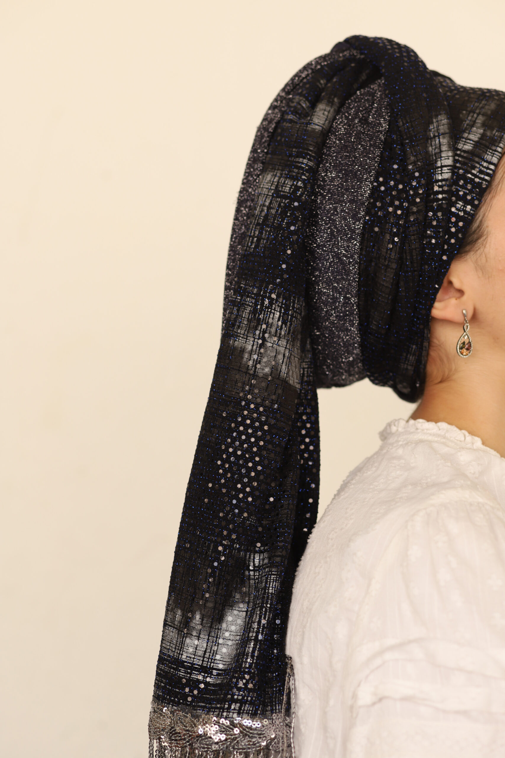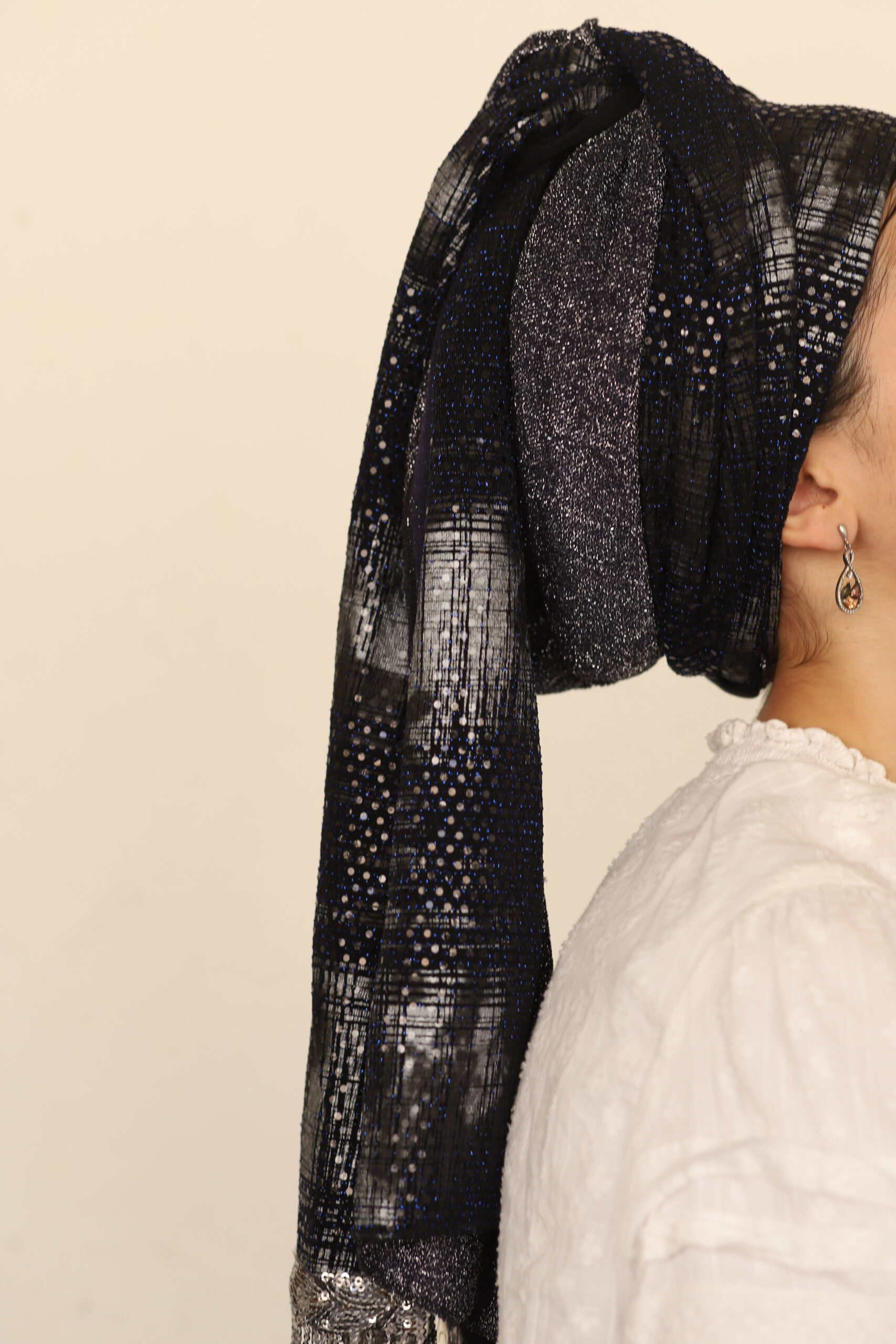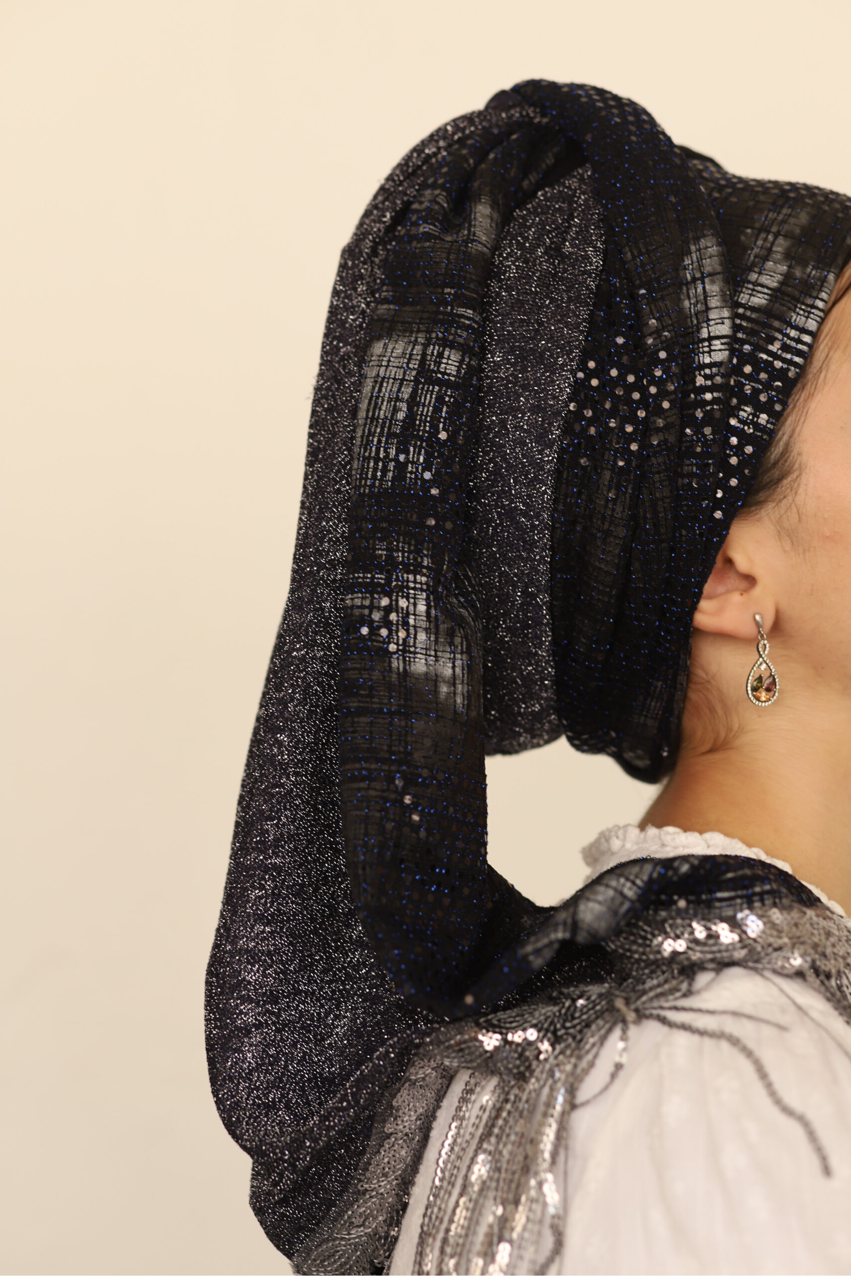 מטפחת מבד כחול עם טקסטורה ובד כחול נוסף בתוספת סרט עם פייטים נופלים לתוספת יופי בקשירה.