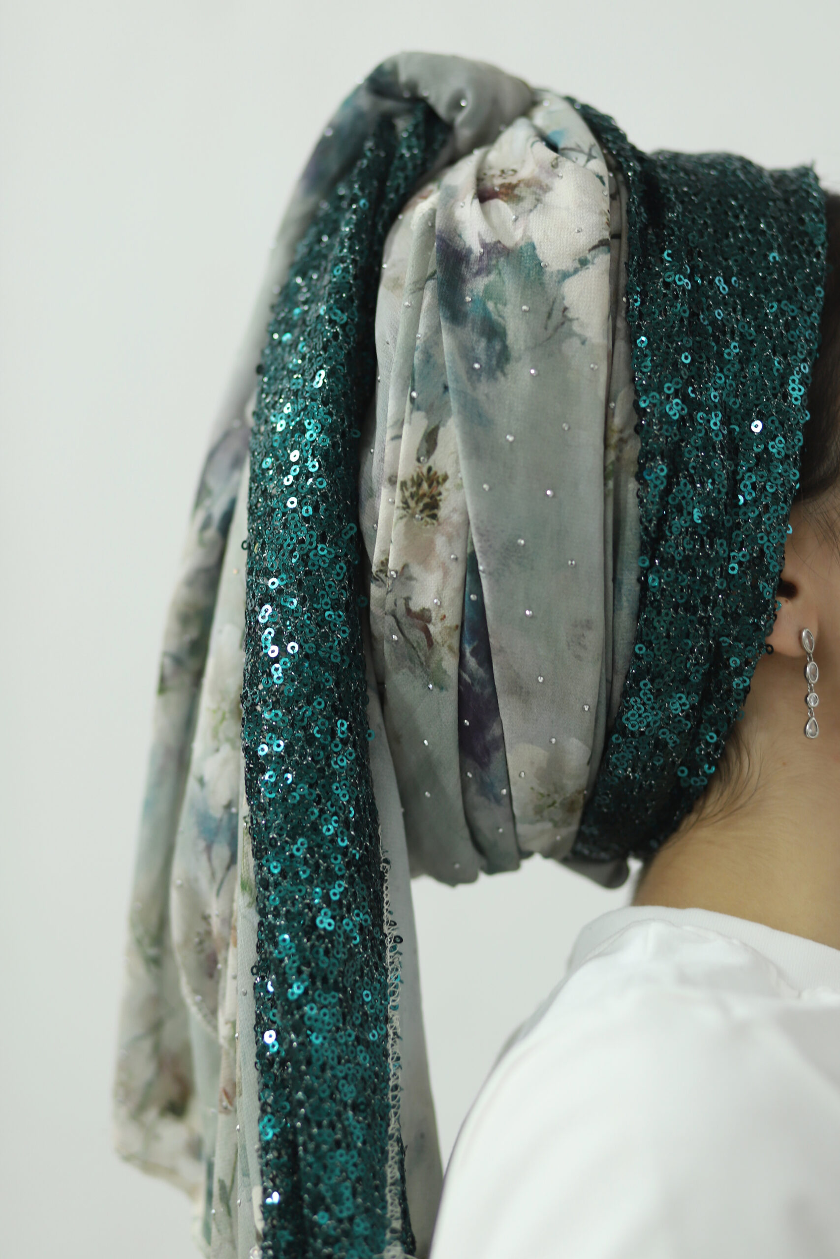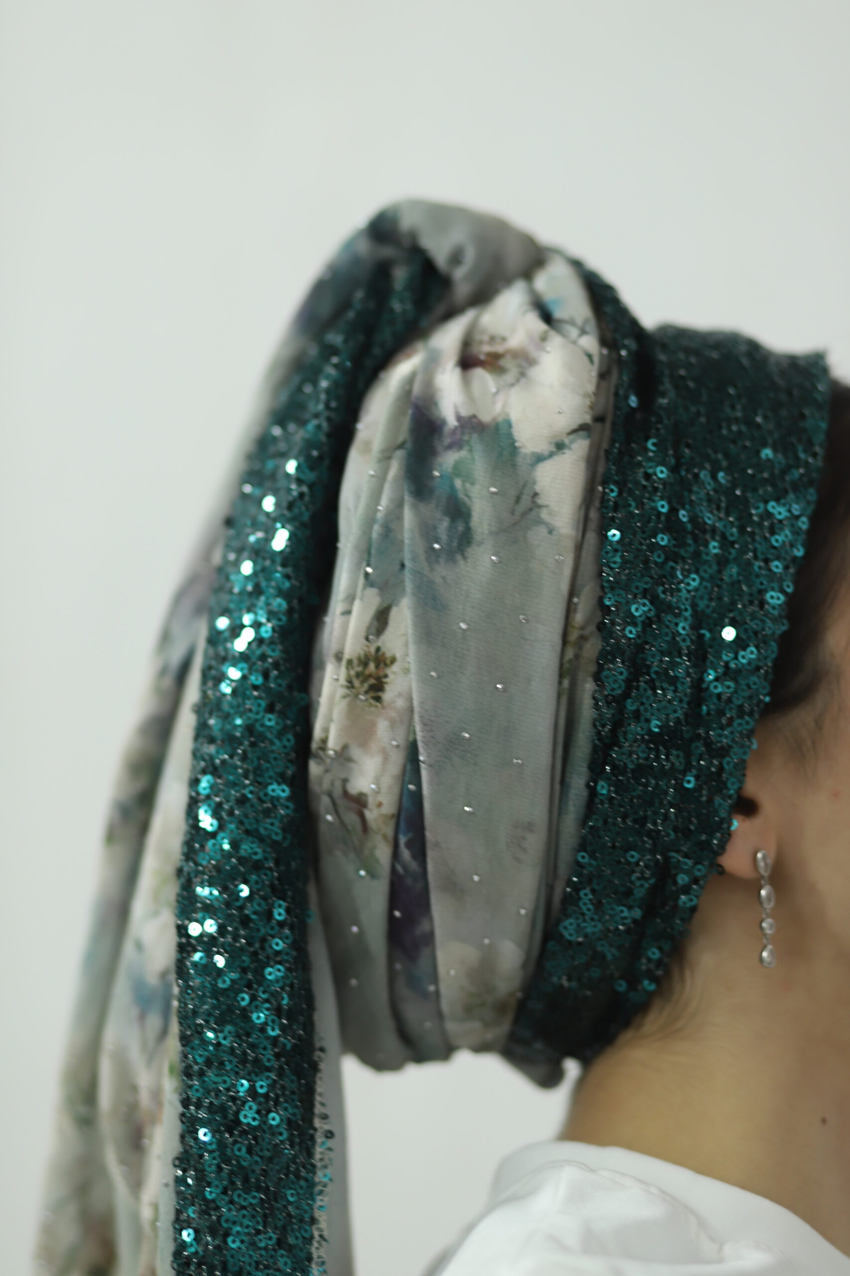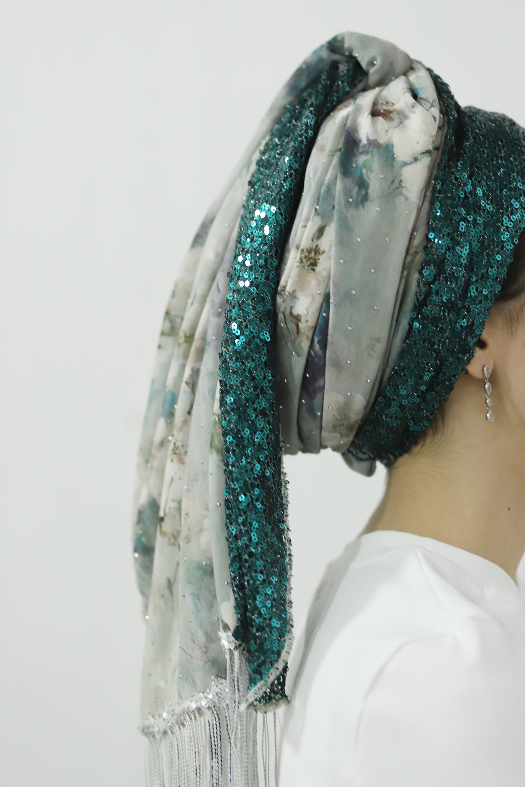 מטפחת מבד שיפון מדוגם ובד פייטים בגוון תואם. בצד המטפחת סרט עם פייטים נופלים לתוספת יופי בקשירה.