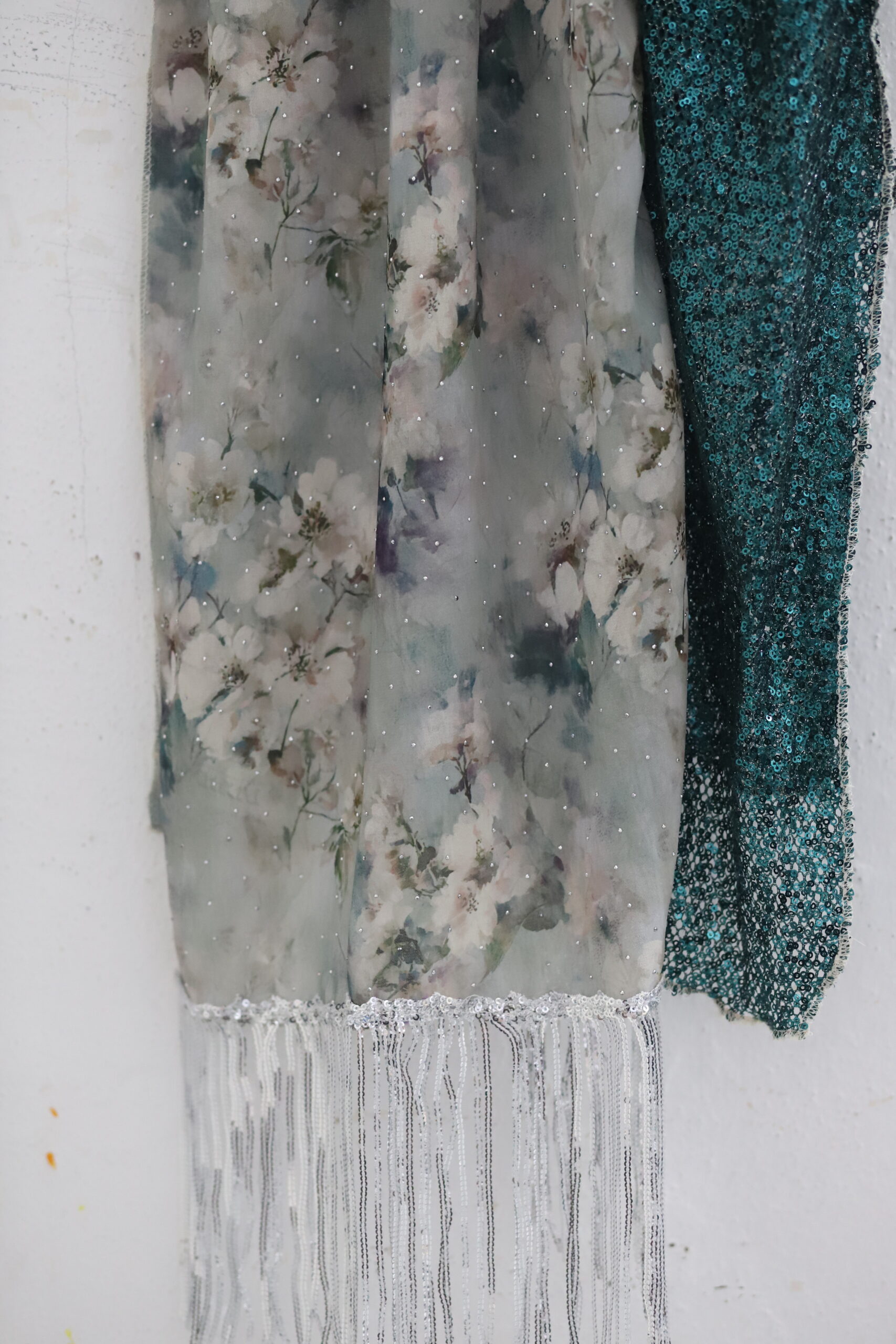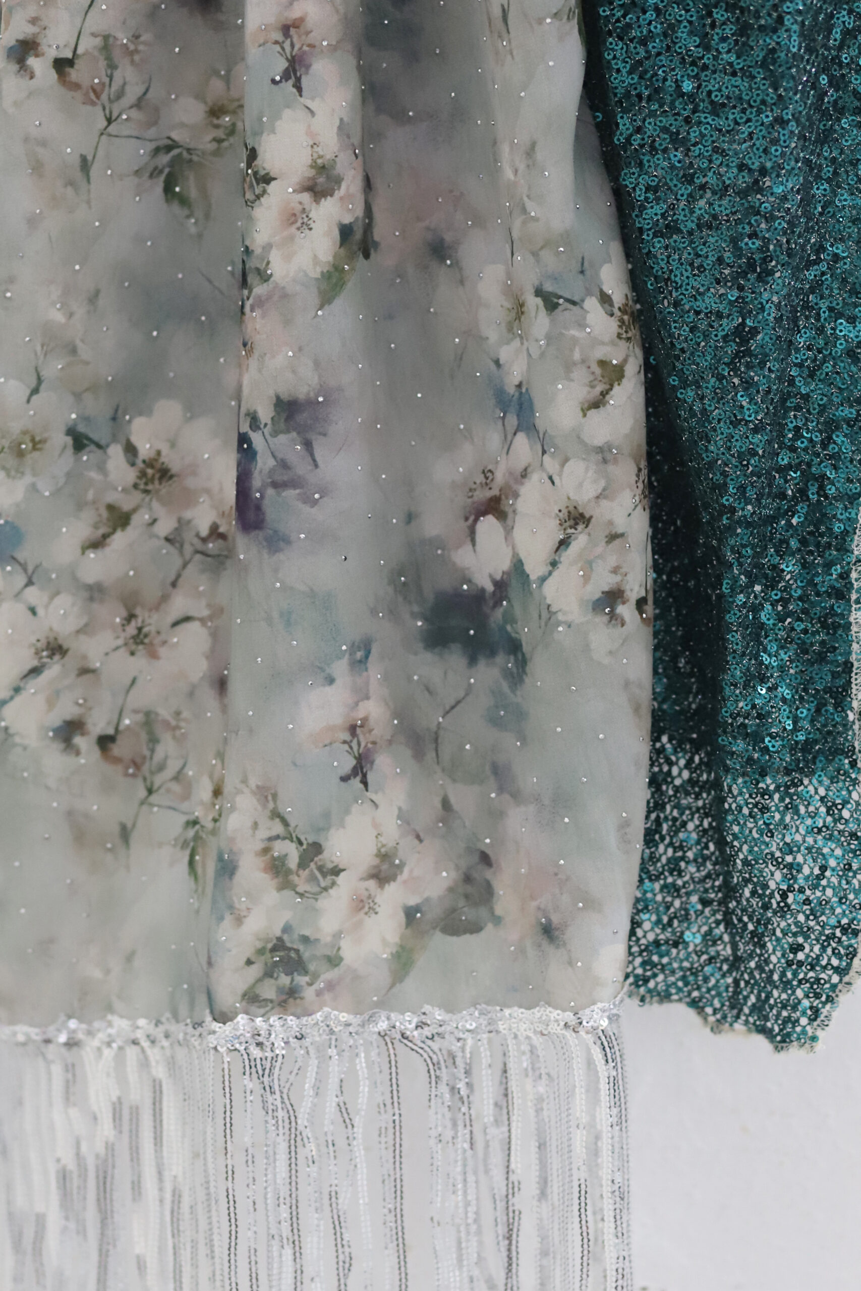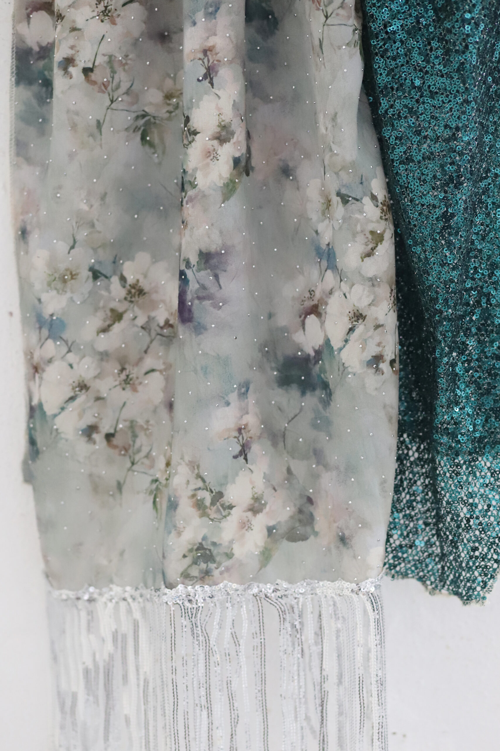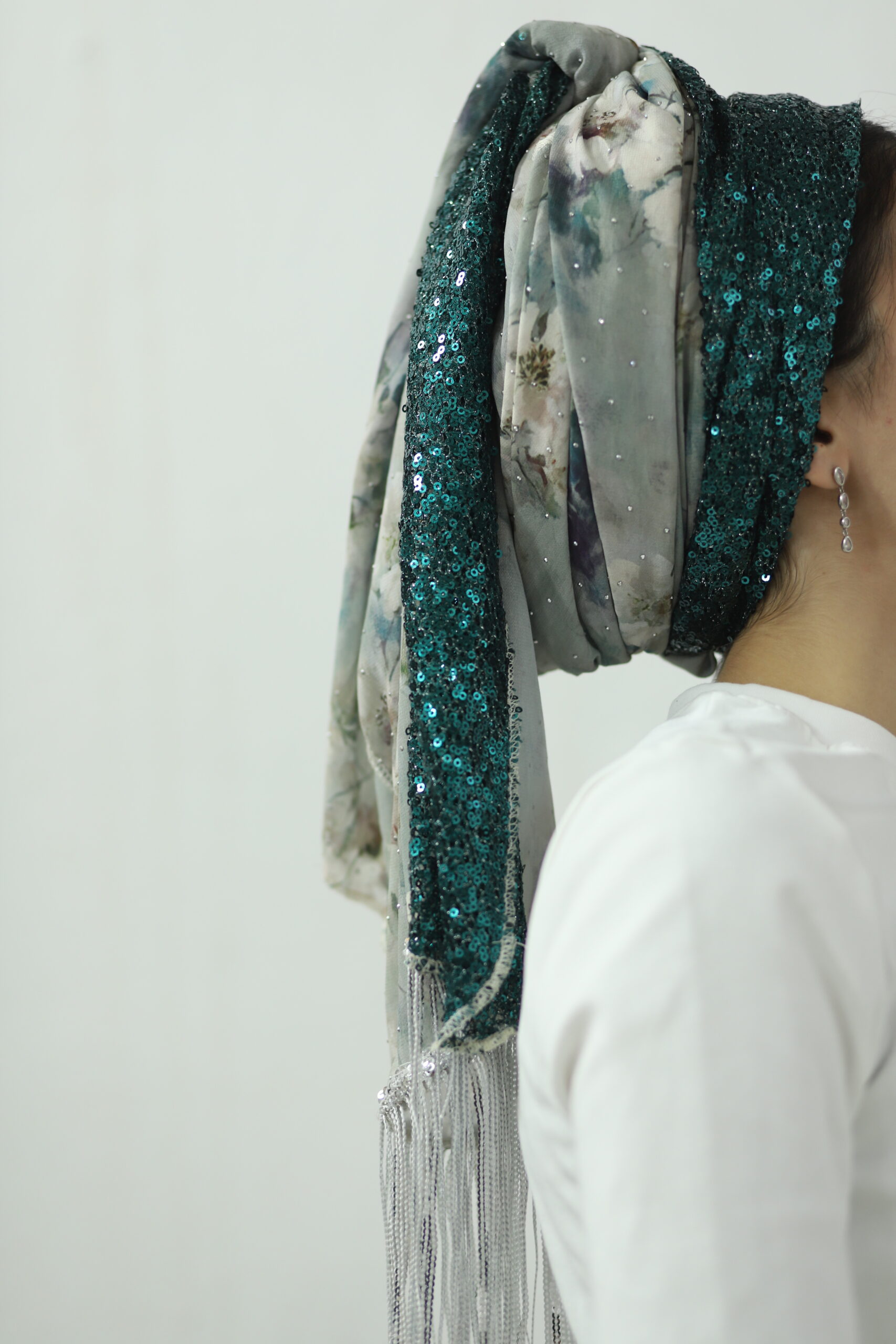 מטפחת מבד שיפון מדוגם ובד פייטים בגוון תואם. בצד המטפחת סרט עם פייטים נופלים לתוספת יופי בקשירה.