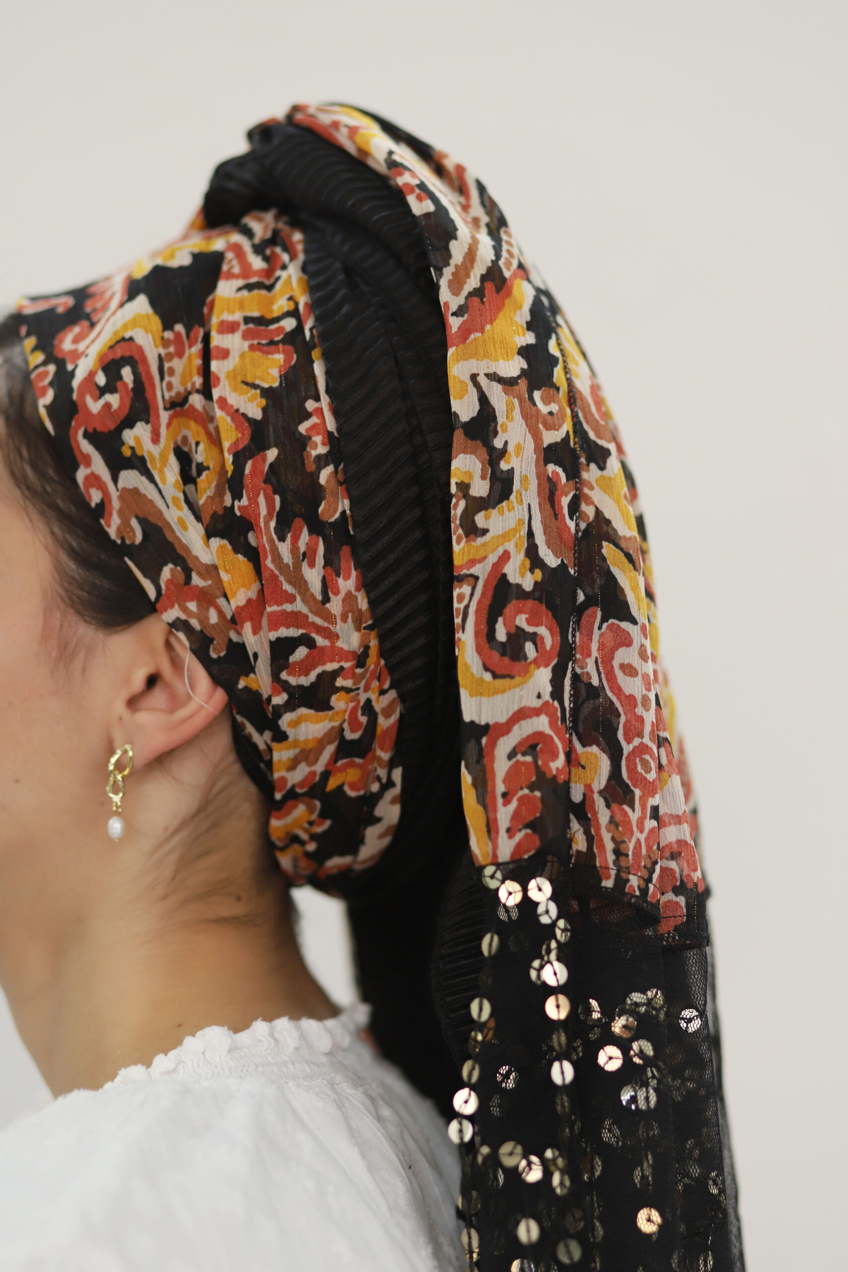 מטפחת המורכבת משני בדים. בד פליסה בצבע שחור ובד שיפון מקושקש. בצד המטפחת בד שיפון עם פייטים נופלים לתוספת יופי ומיוחדות לקשירה.